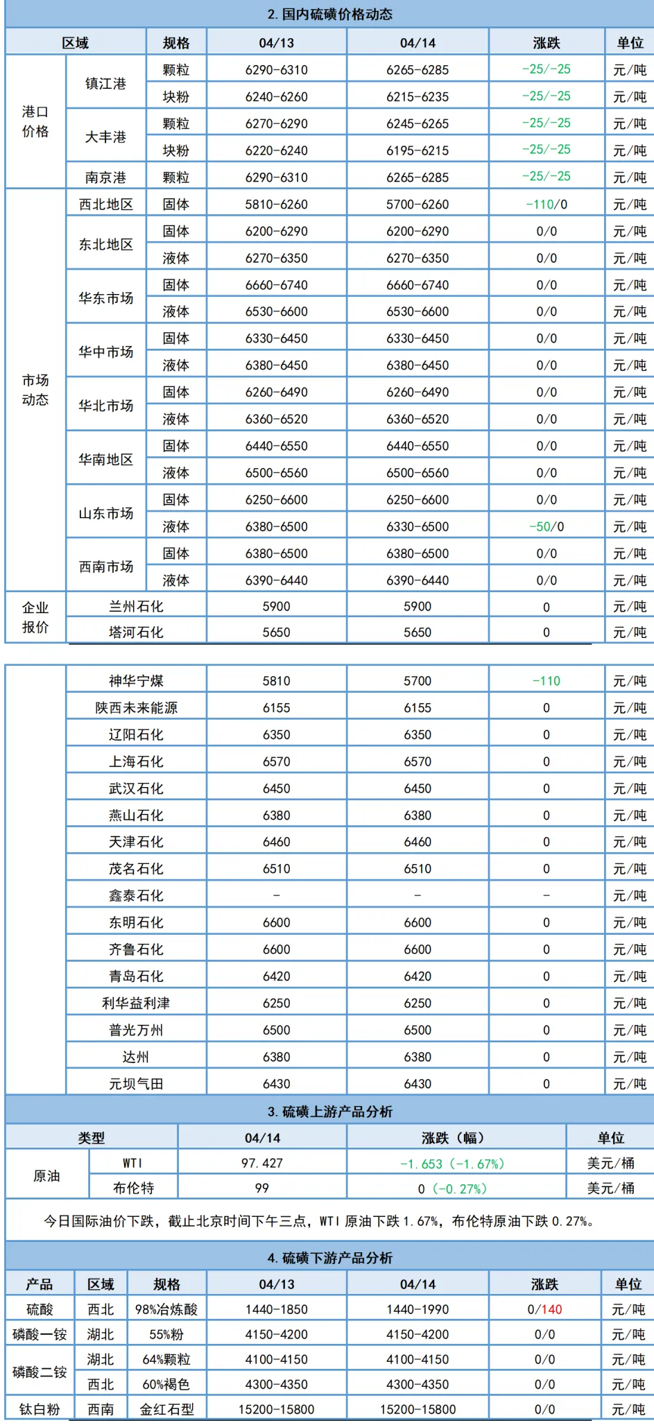 国产硫磺市场价格持稳为主,局部下行。山东、华北、西北地区部分炼厂下调报价,幅度20-150元/吨;其他地区硫磺价格以稳呈现;预计短期国产硫磺市场价格或高位回调。