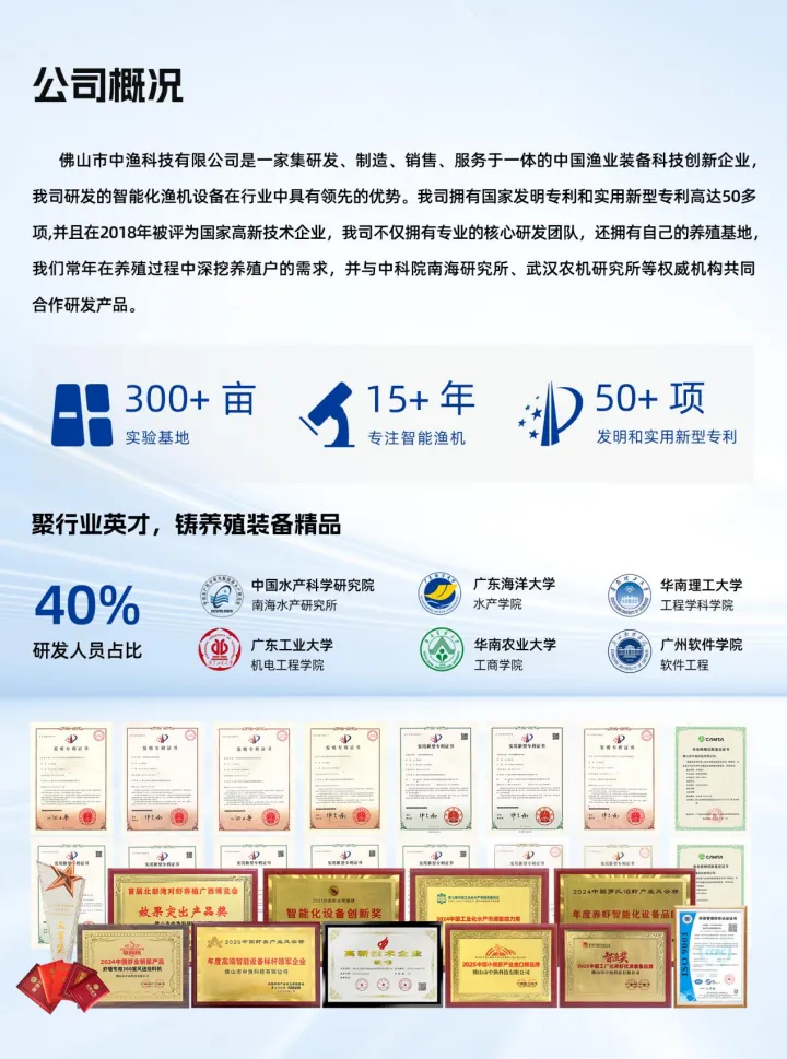 佛山市中渔科技有限公司是高新技术企业,中国渔业科技设备创新企业,现代化智慧渔业装备专业品牌,集研发、制造、销售、服务于一体,发明专利以及实用新型专利超50项。主营鱼塘投料机系列、虾塘360度投料机系列、鱼塘免搭台180/360度小型风送投料机系列、生鲈鳜投料机系列、工厂化投料机系列、投料机增氧机远程控制系统等,其研发的自动巡航喂虾机曾两次登上《CCTV》我爱发明栏目。