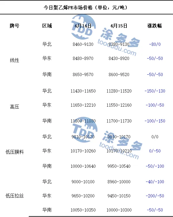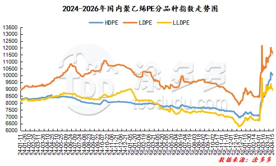 今日国内PE市场价格整体呈现弱势整理的走势。华北地区仅低压膜料牌号的市场价格维持稳定,线性、高压、低压拉丝牌号的市场价格均较昨日下跌,价格下调区间在40-150元/吨,华东地区线性、高压、低压膜料、低压拉丝牌号的市场价格均有不同程度的下跌,价格调整区间在50-200元/吨,华南地区线性、高压、低压膜料、低压拉丝牌号的市场价格均有所下跌,价格波动区间在50-150元/吨。近期聚乙烯市场价格运行偏弱,石化厂家出厂定价整体保持相对稳定,仅针对不同牌号产品进行小幅调整,其中多数规格价格下调50-300元/吨,少数特殊牌号因供应或需求因素价格上调150元/吨。市场整体交投氛围偏淡,下游客户拿货积极性不高,现货成交多依赖双方议价,实单价格灵活性较强。贸易商为加快出货节奏,普遍采取让利走量策略,报价跟随市场行情实时调整,整体价格水平持续下移。下游行业采购操作较为理性,多以满足自身刚需为主,缺乏批量备货意愿,市场整体成交清淡,价格走势受供需博弈影响明显。