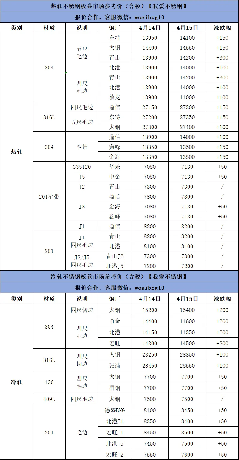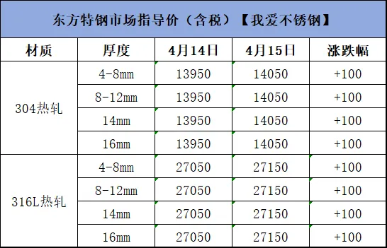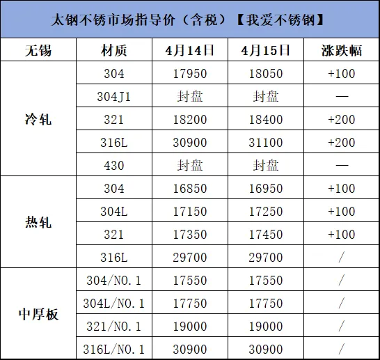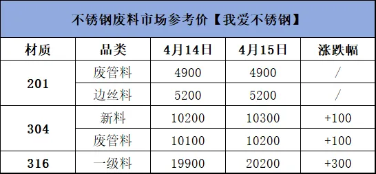 >4月15日不锈钢材料价格行情参考