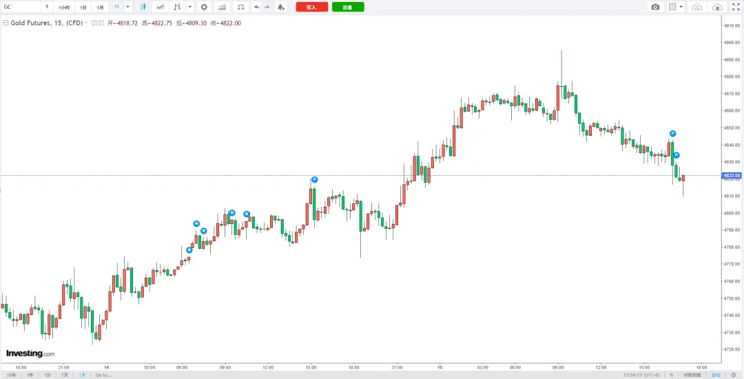 今日黄金市场呈现明显的内强外弱格局。国际金价早盘冲高至4870美元后回落,在4800美元关口反复拉锯,主要受获利了结盘打压;国内金价则逆势走强,受央行持续购金和人民币汇率支撑,黄金T+D站稳1055元上方。