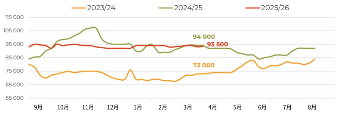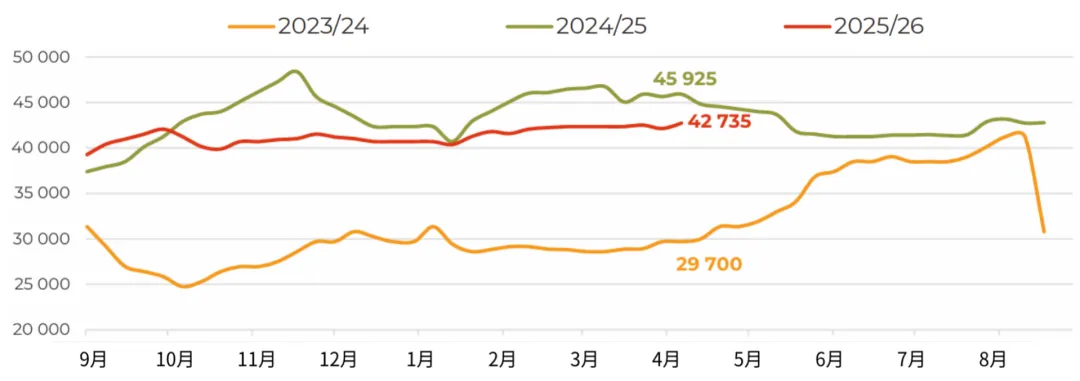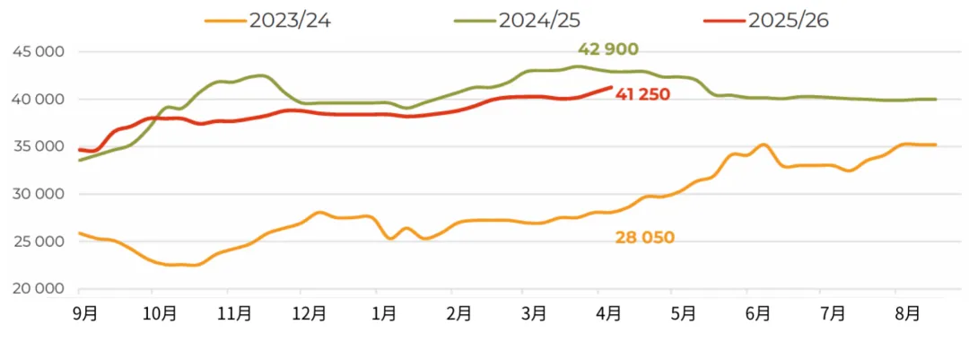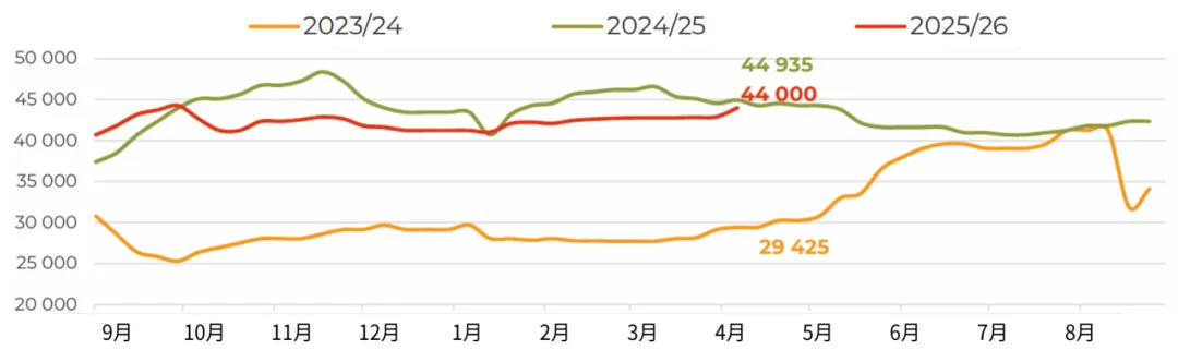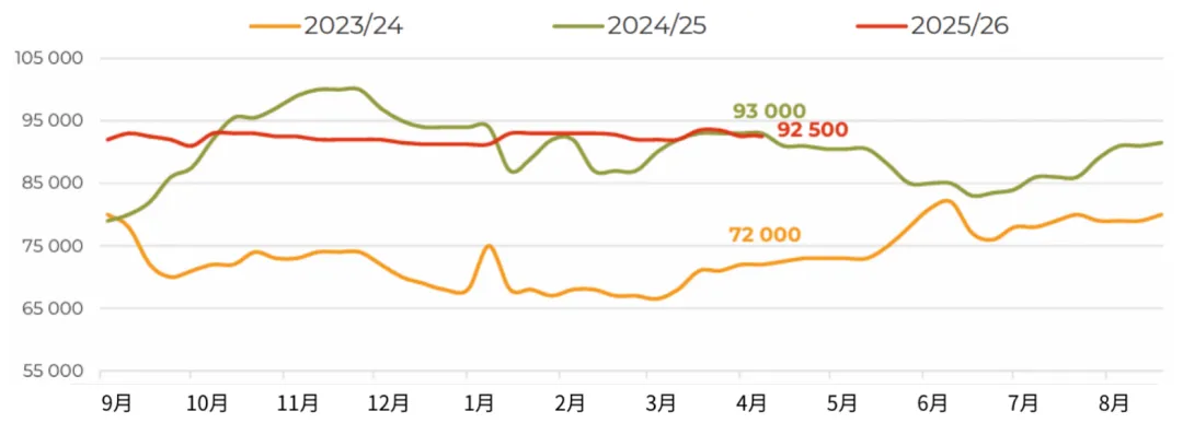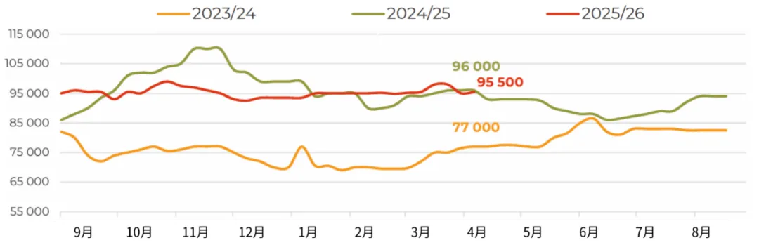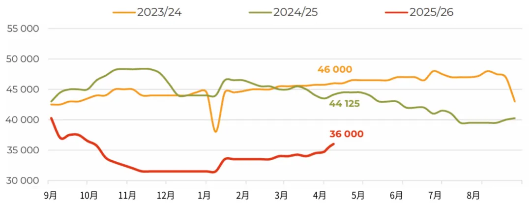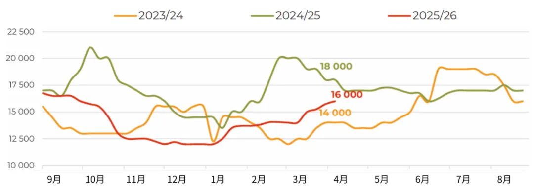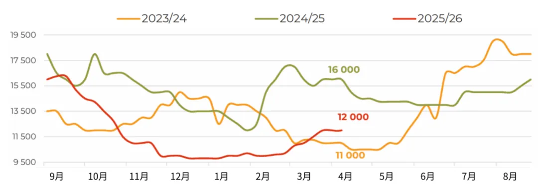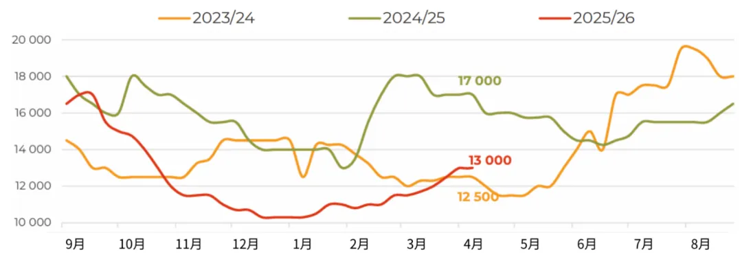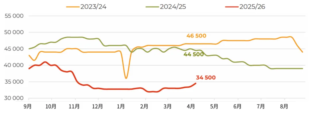 3月,俄罗斯对华大豆出口量增至近12万吨(环比增长54%,同比增长104%),创下自2023年12月以来的单月最高纪录。不仅来自中国买家的强劲进口需求,迫使业界将2025/26年度本国油籽出口总量预估上调至接近100万吨(较2024/25年度增长67%)。目前我们注意到,上个月的市场走势在一定程度上打破了加工企业对采购价格走势的预期。此前市场普遍认为,采购价格可能重演秋季行情,在库存充裕的背景下再次走低。然而,中国需求的增长、白俄罗斯的稳定采购,以及经由里海流域时隔已久首次向伊朗大规模发货(估计约2.5万吨),导致加工企业面临一定程度的供应短缺。这使得中央联邦区卢布计价的大豆价格在当月上涨了约5%,也让农户在新作物年度播种前夕对大豆定价前景更加乐观。随着远东地区500吨零关税原料出口配额即将用尽,未来对华油籽出口可能会放缓,但目前滨海边疆区和阿穆尔州对该配额的利用率仅约为55%。而未来对伊朗的出口前景,还将取决于地缘政治背景下南美大豆对中东地区出口的节奏