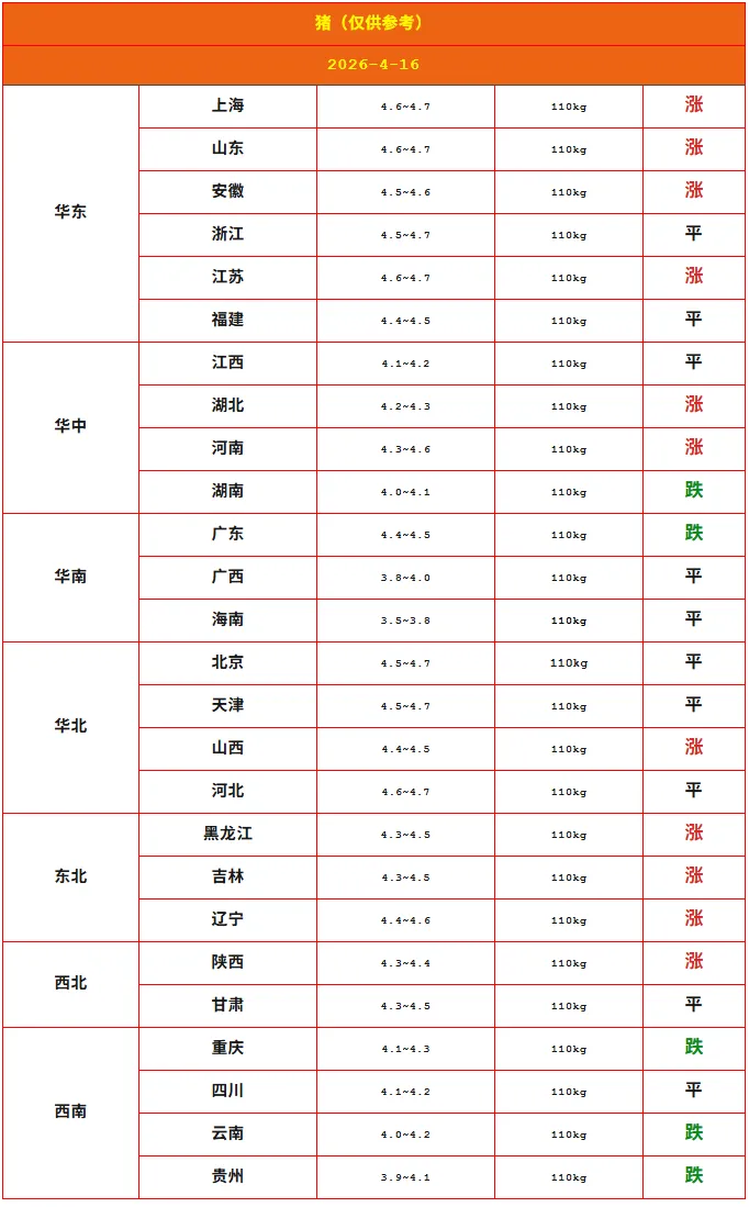 >2026年04月16日全国猪价行情表