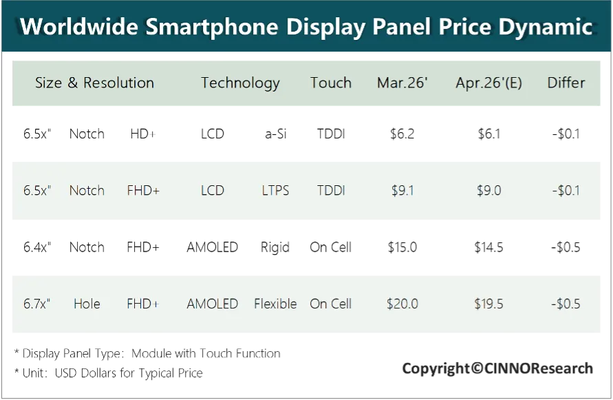 进入第二季度,手机面板市场仍面临严峻挑战,延续第一季度的承压格局。上游存储器价格持续走高与大宗原材料成本上涨,导致终端品牌采购策略愈发谨慎。为争取有限的订单,面板厂与模组厂延续“以价换量”策略,各技术路线面板价格将继续承压下行;