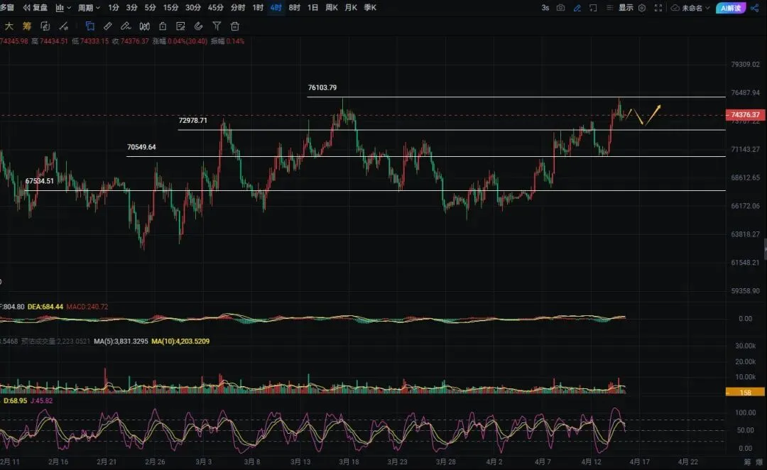大饼如期在76000遇阻回落,昨日预判的多空点位均精准应验,75600空单顺利走出1800刀左右回落空间,当前币价回落至74000附近温和整理,属于上涨途中的正常技术性休整,无趋势反转信号,日线保持稳步向上,均线给予温和支撑,前K突破布林带上轨并未企稳,收长上影后回撤震荡下行,布林带维持开口,短期均线向上,MACD快慢线向上延伸但量柱缩量,KDJ三线粘合向下,需留意100值附近阻力,VR指标在90值附近盘整,大趋势依旧偏多,下方72500-73000为重要守护支撑位,上方持续关注76000阻力强弱,大饼4小时级别上升结构完好,连续收针转阴线震荡下行,上涨动能有所放缓,目前运行在7日均线下方,布林带开口,短期均线微微拐头向下,MACD快慢线向下延伸且量柱持续缩量,KDJ交叉向下需关注0值附近支撑,VR指标在160值附近盘整,短线处于震荡消化阶段,回踩仍是布局时机,1小时级别在区间内平稳波动,方向未明静待选择;