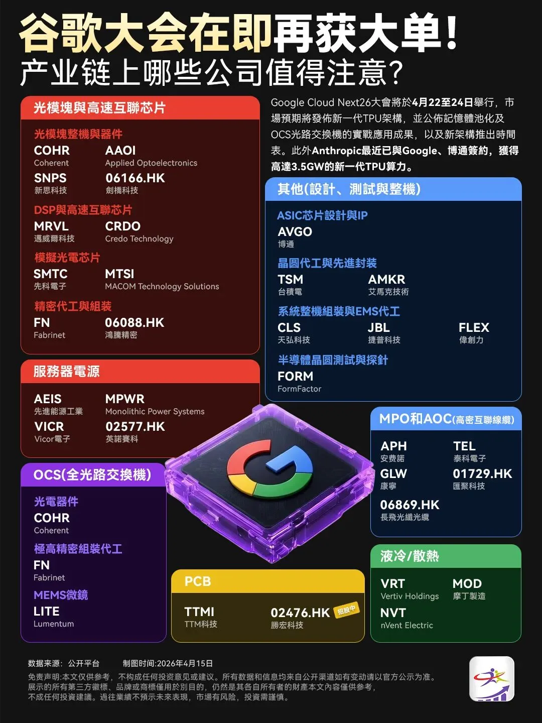 尽管AI主线展现出惊人的爆发力,但面对当前的宏观局势变动,投资者仍需警惕部分热门股估值透支及资金过度拥挤的风险。下周4月22日谷歌云 Next '26开幕,消息面上先是博通官宣和谷歌、Anthropic 三方绑定,给 Claude 模型砸下 3.5GW 的 TPU 算力,这规模直接把 AI 算力军备竞赛推到了新高度!现在市场都在押注,谷歌这次会在大会上放出新一代 TPU 架构、OCS 光路交换机的实锤成果,整个算力产业链都在预热。这波谷歌大会的催化,本质是 AI 算力军备竞赛的延续,不管是 TPU 升级还是 Anthropic 的算力大单,最终都会传导到产业链的各个环节。整理了这波行情里,最值得蹲的产业链细分方向,新手也能一眼看懂👇證券融資服務