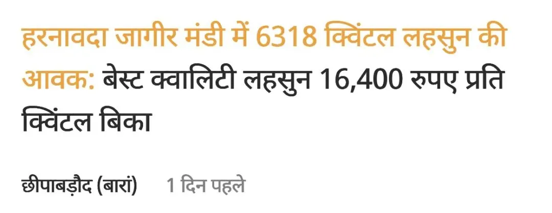 - 拉贾斯坦邦 (Chhabra Mandi):乌蒂大蒜 13,900 卢比 - 14,000 卢比/公担