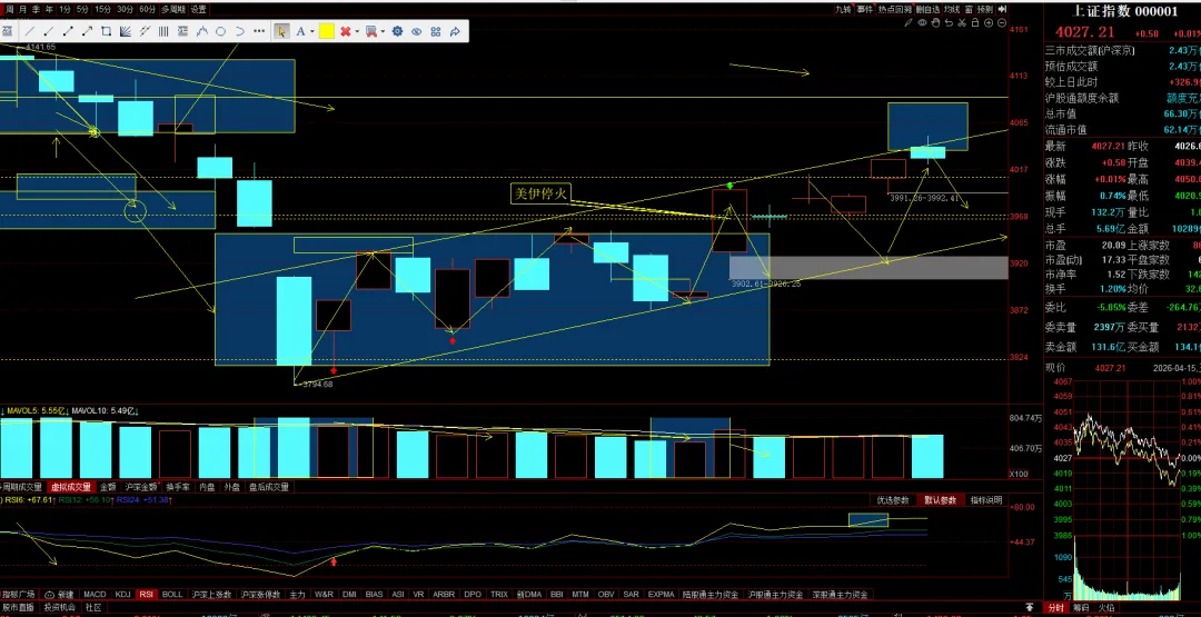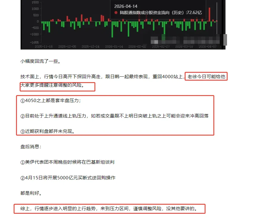 今日沪指涨0.01%,深成指跌0.97%,创业板指跌1.22%,两市成交额2.42万亿,较上一个交易日放量315亿,市场高开低走,创业板指盘中刷新2015年6月19日以来新高,此后回落跌超1%止步5连阳。技术面上,昨晚给大家分析的完全验证,已经给大家说的明明白白,可别说没提醒短期调整的需求。不过大家也别太担心,这个调整属于技术性调整,毕竟到了压力且近期持续表现过了,大家减减仓,回踩3950再把卖出的接回即可。消息:中国人民银行、国家外汇管理局:将境内外商独资银行、境内中外合资银行、外国银行境内分行的境外贷款杠杆率由0.5上调至1.5,香港特别行政区、澳门特别行政区和台湾地区的金融机构在内地(大陆)设立的银行机构比照适用。将进出口银行的境外贷款杠杆率由3上调至3.5。如计算的境外贷款余额上限小于100亿元,核定该银行境外贷款余额上限为100亿元。境内银行通过向境外银行融出资金等方式间接向境外企业发放一年期以上本外币贷款的,可由境外银行依据其所在国家或地区相关法律法规办理。算是利好,对外围放D增加3倍,刺激招商因此,但是传导到大A可能就没太大影响了。消息:美伊原则上同意延长停火