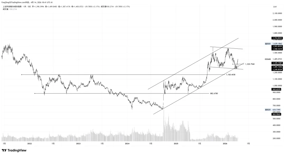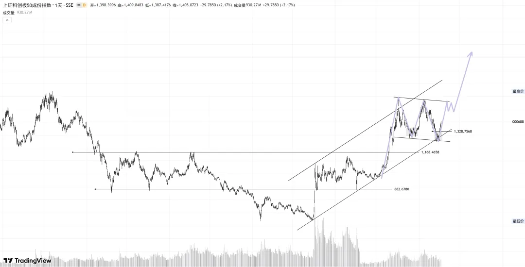 科创50,这个左侧的位置我们前面是摸到的。右侧的话,按照计划是暂时踏空,原本考虑回踩一下,并没有给,优化为等昨天的低点1360附近。
