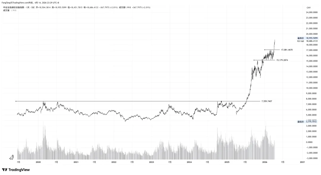 通信,这个前两天说,正常看涨。另外就是如期的话就是得加速,如果再跌回区间就警惕见顶的风险。