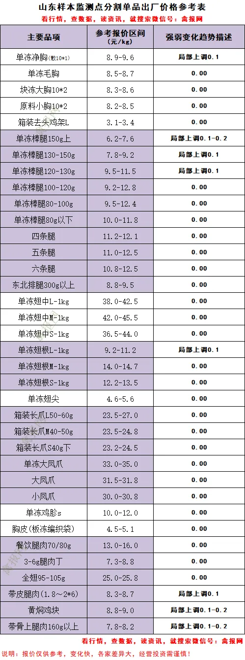 1、总体基本面止弱略走强。多点部分单品仍可根据实际订单情况灵活议价或执行有条件的优惠政策,不过今天局部样本点单冻胸类、翅根L、大规格棒腿报价有上调,幅度100-200元/T。伴随社会毛鸡供给基本面的持续偏紧和相对高位,当前屠宰厂实时宰杀利润开始进入亏损区间,这几天屠宰厂减停产情况比较明显。但是,需求侧终端走货没有明显改善。(1)山东地区:a、明日进厂社会毛鸡报价保持稳定,不过局地社会鸡仍有加价,主流价格3.55-3.65元/斤区间; b、毛鸡坚挺,当期宰杀利润多点进入亏损状态,产品库存持续高位,屠企宰杀积极性差,减停产规避情况明显;c、鸡苗计划顺畅,报价稳定,局部有小幅显慢议价情况。
