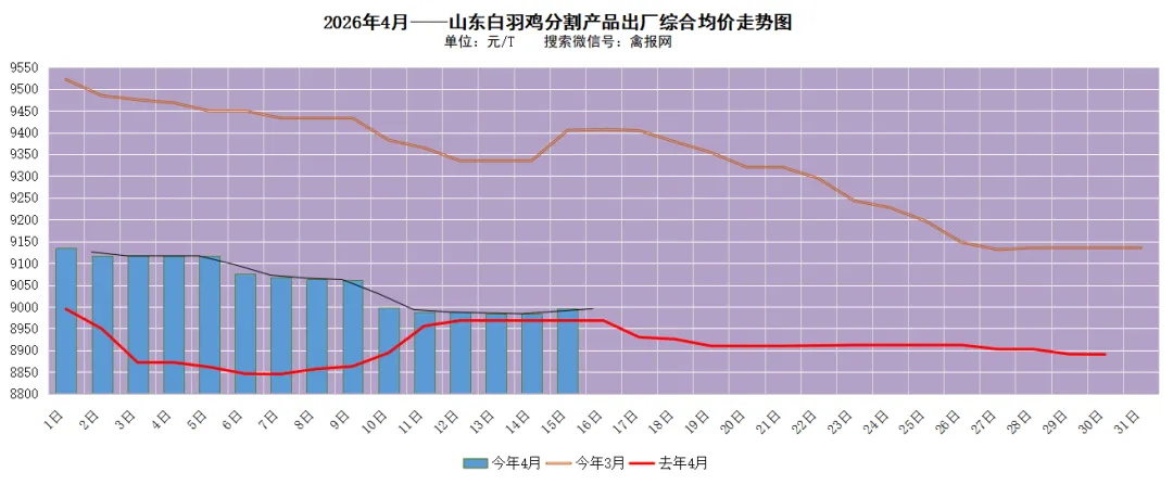 附注:以上所有观点分析,仅供参考,冻品市场变化较快,注意风险!附注:据禽报网监测数据,2025年4月的月均吨综合售价日均值为8913元/T,2026年3月吨综合售价日均值9331元/T。