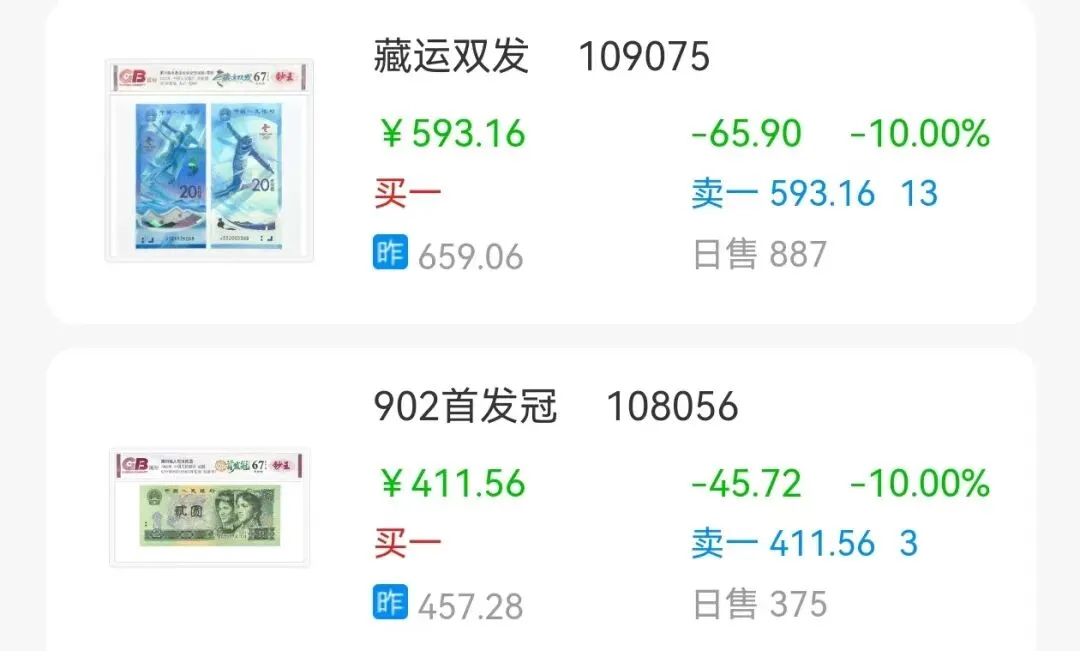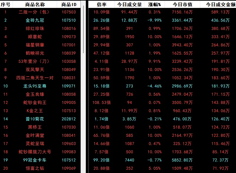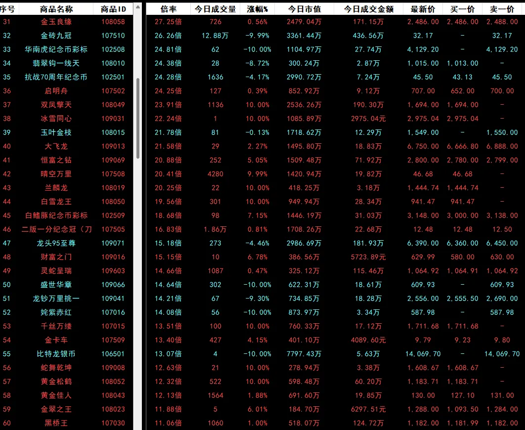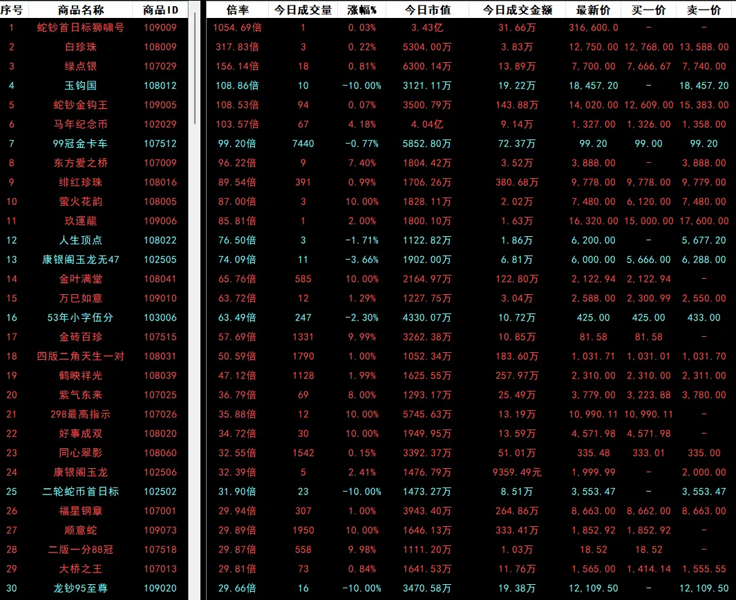 今日上涨倍率前60名里,封住涨停的14只,相比昨日减少6只。封住跌停板的有8只,相比昨日增加2只,市场整体依然强势。成交额5657万,相比昨日增加335万,保持稳定。市场持续反弹中,期待未来更多的品直接被动带飞起来。成交额前20名里,上涨16只,下跌4只,表现非常抢眼,人气品种继续领跑整个市场。今天开板两只新票,市场骂声一片,直接微高于直播间售卖价封装跌停板!如此低的上涨幅度直接封住跌停板的情况对整个市场的负面影响不小,对未来一级市场发售新品的影响就更大了。一级市场的客户在未知是否上市,更不知道何时上市的前提下愿意相信挂牌商高价入手,最后得到这样的结果确实是让人很难接受的。顺意蛇:今天之前已经放量7天了,而且今天也是宽幅震荡之后还能封住涨停板的,这也是很难得的,相信之前抢单介入和打新中签的参与者在今天抛盘不少,如此洗盘之后还能涨停,未来还是值得期待的!53年一分刀:全天强势,单边稳步上行,尾盘拉升涨停。最近一个月见底后震荡上行,现在的价格相对不是很高。这是一个老品种,历史上走的行情也是非常漂亮的,成交也非常稳定。从最近的行情来看,逆势震荡上行,相信主力消耗不少资金,回收了大量的筹码,未来非常值得关注。双凤擎天:2连扳,20分钟快速封停,涨停后全天没有一张卖盘,期待主升行情。金玉满堂:新票,一直震荡上行,无压力位,结合过去一个月的行情,该品敢追敢拿的应该不多,上涨无极限!蛇钞朦胧刀大号:历史新高一步之遥,该品波动率不错,未来应该是一个很有意思的品,值得期待,应该会给出不少的机会。粉红墨玉:低位启动,有消息面的传言,调整到位,启动后有望走出该品的开板后的主升行情!白雪龙王:上涨2倍有余,11连板。该品上市开板先跌55%之后再开启主升行情,这个品的例子就是告诉我们,指数投资,即使再不看好的品未来都可能走出超级大行情!总结:市场行情分化明显,在整体大行情到来之前我们需要对市场多加关注,现在的市场已经非常成熟了,几十亿的资金已经趴在了市场里,热门品种一旦被资金追捧,且主力有大想法的情况下属于2026年的超级大牛股应该就能出现了!风险提示:本文仅代表个人观点,钱币行业波动剧烈,入市需谨慎!