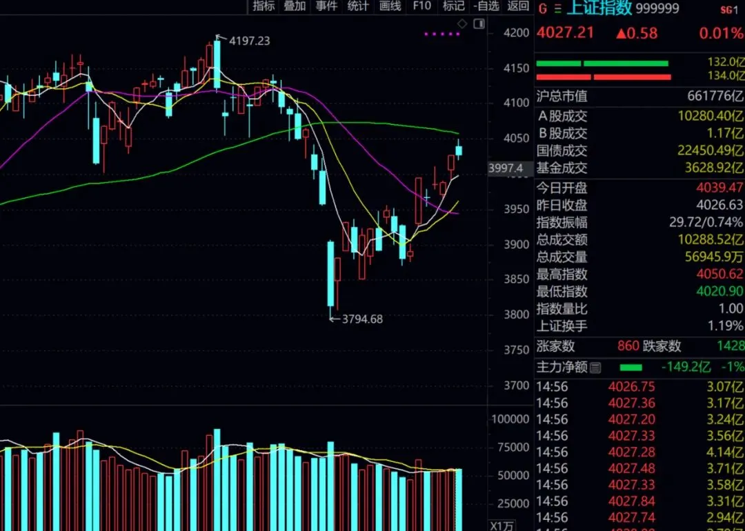 大a股高开真的是原罪,昨天晚上尾盘本来就有神秘资金抢了很多,今天在一个高开不砸才怪。那即使在这种情况下从开盘的快4000家红盘到收盘的只剩1700多家红盘,全天市场人只放量了1%,没放量那这个位置资金就不是出货,所以今天整体走势都还算健康不用担心太多。午盘也说过了趋行情没那么容易结束,这里是上涨途中的正常调整,持股待涨即可。