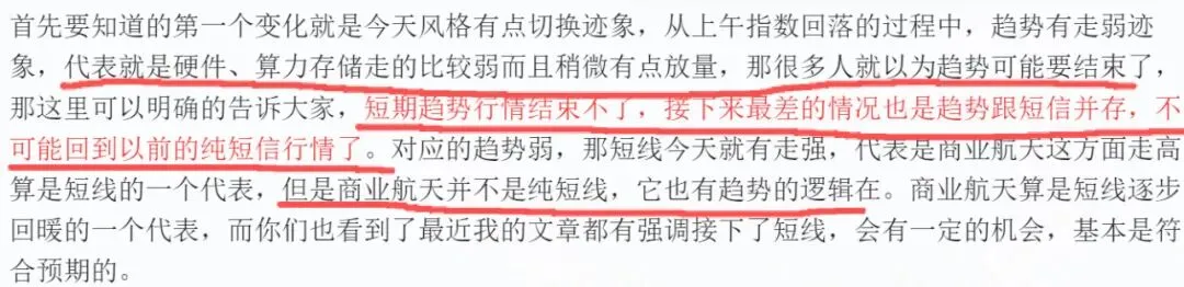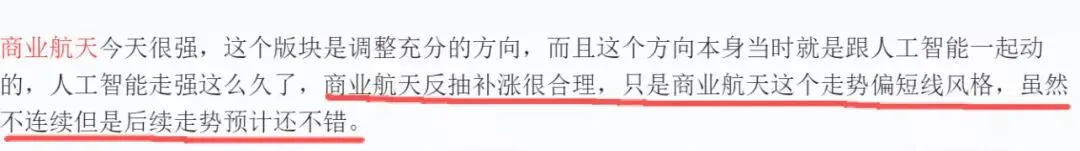 午盘讲了今天唯一多的亮点是商业航天,偏短线的趋势,持续性比锂电、医药这些应该都会好一些,今天大涨的涨停的那些核心个股后续有些应该仍然有看头。