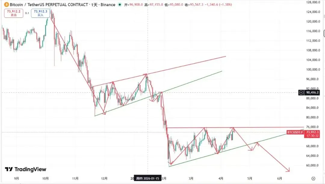 当前价格正处于74200美元这一关键多空分水岭上方,若能守住此位,则上升结构保持完整;若失守,则短期趋势转弱。