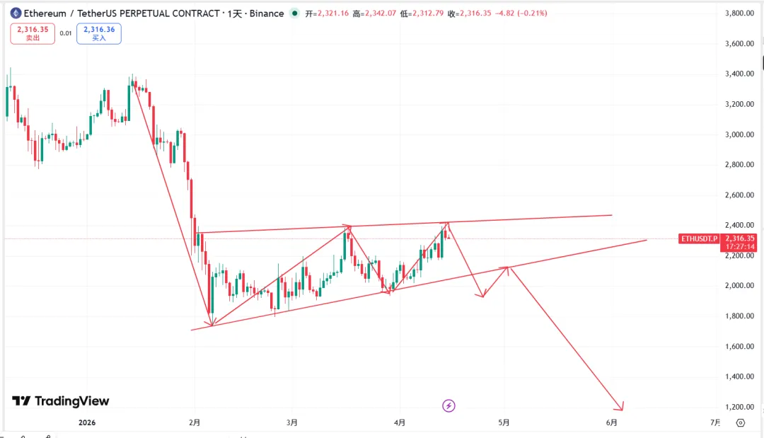 以太坊昨日从2200附近强势拉升,一度突破2400至2416美元,随后快速回落至2320美元附近。当前价格处于日线下跌楔形末端,BBWP波动率指标已降至历史极值,通常预示着未来3-7天内将出现超过15%的单边突破行情。