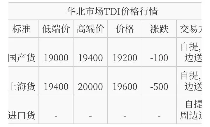 华北TDI国产货报盘价格在19000-19400元/吨,上海货报盘价格在19400-20000元/吨。