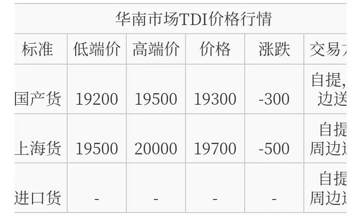 华南TDI国产货报盘价格在19200-19500元/吨,上海货报盘价格在19500-20000元/吨,报盘宽泛。