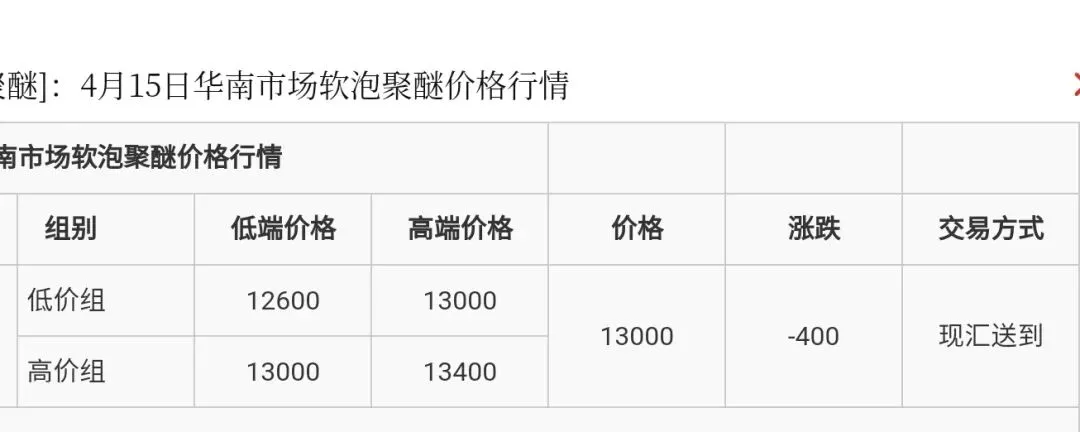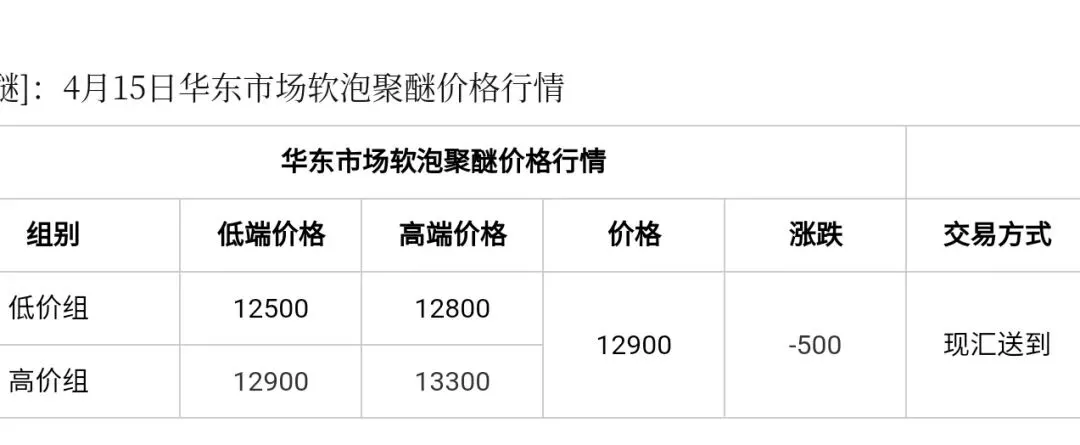 华东软泡聚醚市场商谈参考:低价组成交区间在12500-12800元/吨;高价组成交区间在12900-13300元/吨现汇送到。