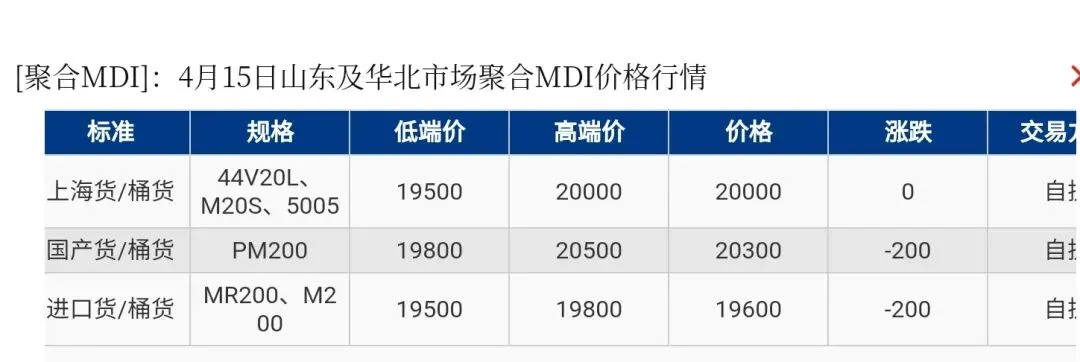 【市场动态】山东及华北区域聚合MDI上海货报盘19500-20000元/吨,国产货(PM200)报盘19800-20500元/吨,进口货报盘19500-19800元/吨。