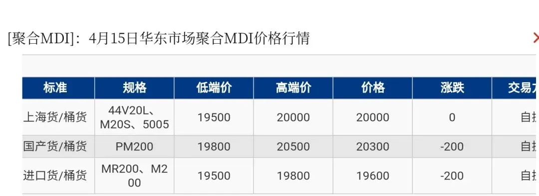 【市场动态】华东区域聚合MDI上海货报盘19500-20000元/吨,国产货(PM200)报盘19800-20500元/吨,进口货报盘19500-19800元/吨。
