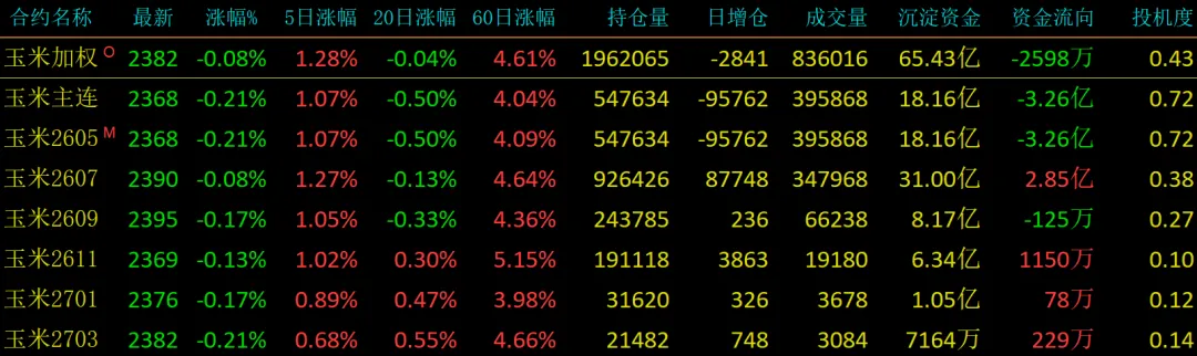 玉米2605:收盘2368,持仓54.76万,期现差-23点,期权剩2天,期货剩16天,锦州港报价2330。