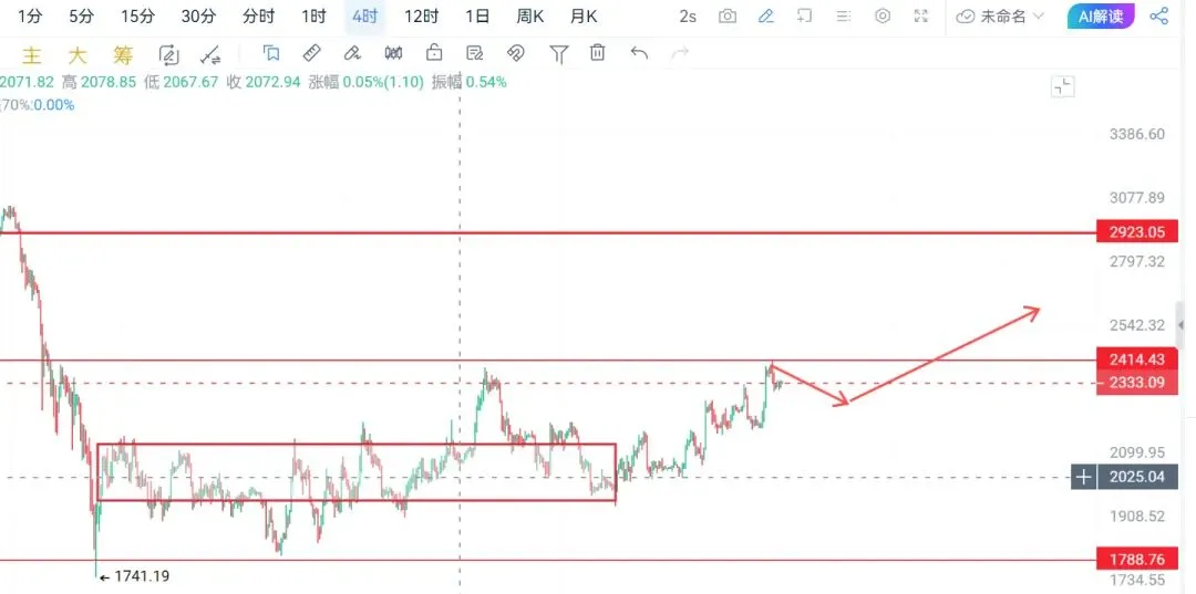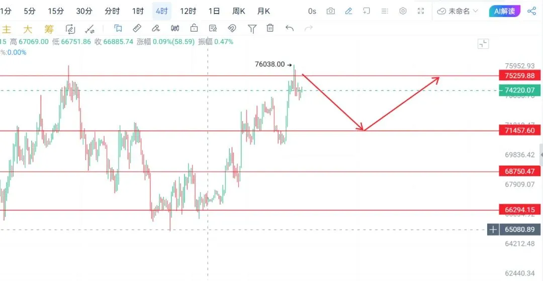 四小时级别来看,行情连续收出长影线后转为阴线震荡回落,上行动能逐步放缓,当前价格运行于7周期均线下方,布林带保持开口态势,短期均线小幅拐头向下,MACD快慢线同步向下运行且量能柱持续缩量,KDJ指标死叉向下发散,需重点关注0值附近的支撑力度,VR指标在160数值附近维持盘整走势;价格触及76000高点后开启连续回落,目前在74000价位附近波动,处于高位回调后的震荡整理格局,布林带层面价格已从上轨回落至中轨上方,轨道整体开口状态不变,上轨形成短期强压力,中轨为核心支撑位,多头结构并未完全瓦解,EMA均线系统中,价格在7周期均线附近震荡,依旧站稳20、30、120周期等中长期均线上方,均线整体呈多头排列,为价格提供有效托底支撑,中期走势依旧偏强;指标方面,MACD双线收敛、量能持续缩减,反映多头动能逐步衰减,短期上行动力不足,存在小幅回调空间,RSI指标保持向上运行,KDJ三线死叉后J线快速下探至低位并临近超卖区间,短线具备超跌反弹的可能性;综合各项技术信号判断,比特币四小时级别中期多头趋势未发生改变,仅短期上行动能不足进入回调休整阶段,当前的技术性修正属于冲高后的蓄势整理,为后续行情再度上行夯实基础。以太坊日线级别昨日冲高至2416附近后遇阻回落,收出长上影形态,日内震荡下行,当前运行于2320一带,整体呈现高位回调格局。布林带维持开口向上,价格自上轨回落至中轨上方,中轨2260附近构成关键支撑,上轨2420区域为强压区间 。均线系统保持多头排列,价格虽短线跌破7日均线,但仍站稳20、30、120周期等中长期均线上方,大级别多头结构未被破坏 。MACD双线在零轴上方延续上行,但红柱逐步缩量,多头动能有所衰减 。RSI从超买区间回落,未进入超卖,KDJ三线死叉向下,临近低位存在超跌修复可能 。综合来看,以太坊日线中期多头趋势未改,短期处于冲高后的震荡消化阶段,回调以蓄势为主,守住2260—2300支撑带,仍有再度上行动能 。以太坊4小时周期冲高后进入震荡整理,价格自高位回落并维持区间波动,短线多头动能有所放缓,布林带保持开口格局,价格回落至中轨上方运行,中轨形成短线支撑,上轨区域构成明显压制,短期均线小幅拐头但中长期均线仍呈多头排列,对价格形成托底效果,MACD双线在零轴上方走平缩量,多头力度有所减弱,KDJ指标向下收敛并接近低位,RSI从高位回落但未进入超卖区间,VR指标维持相对活跃水平,整体来看4小时级别中期多头结构并未破坏,当前属于上涨途中的技术性回踩与筹码消化,守住关键支撑区间后仍具备震荡回升的条件,短期以震荡蓄势看待即可。大饼:73500-73000附近多,目标:76000-76500附近二饼:2320-2300附近多,目标:2380-2400附近文章具有时效性仅在发布的一刻对行情作出判断,不构成投资建议,具体以私下一对一指导为主,QQ:3911677020