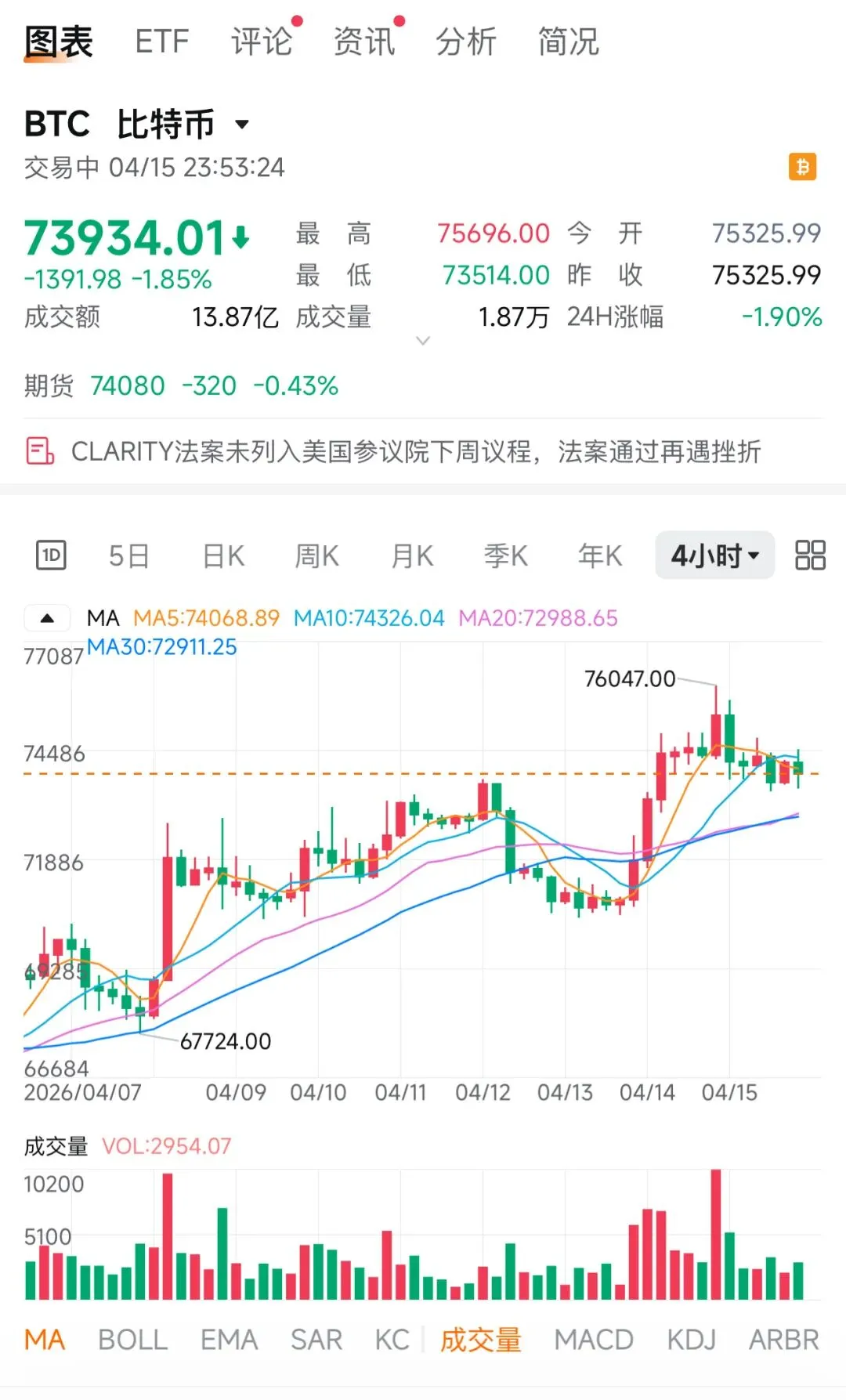 大饼:74200-74800区间可布局空单,下行目标看73000-72500区间。