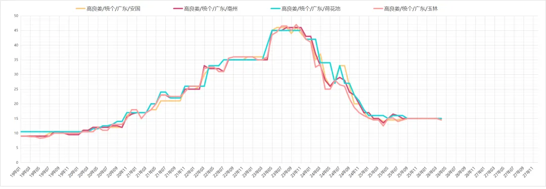 高良姜行情回落,目前正值产新,受需求疲软影响,近期货源走销不快,现市场货源因质量不等多报价在13-15元之间,继续关注后期货源走销情况。