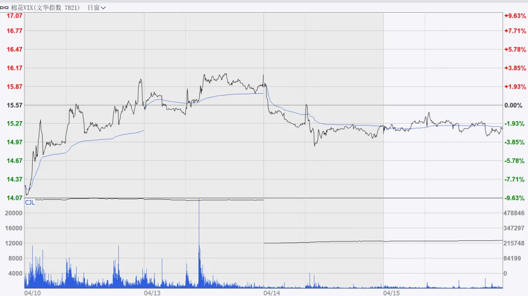 2.波动率:当日VIX震荡下行,说明市场对棉花的波动预期降温,期权买方情绪回落,卖方占优,短期价格大幅波动的概率降低,更偏向区间震荡。3.量仓匹配:VIX指数下跌但持仓增加,说明有资金在低位布局波动率多头,等待后续行情启动,隐含波动率处于历史中性区间,未出现极端高估 / 低估,期权策略以中性对冲为主。二、4月15日行情多维复盘