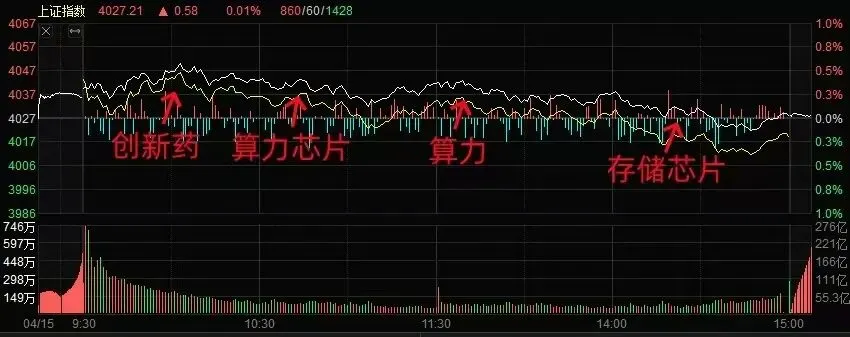 4月14日,中科曙光发布由6万张国产加速卡构成的国内迄今规模最大的AI4S计算集群。国产算力产业链再获提振,并购重组人气股大胜达封一字涨停,沐曦股份大涨超10%,摩尔新的、芯原股份、寒武纪等盘中一度大涨超5%。此前中国移动发布2026-2027年人工智能超节点设备集中采购项目,超节点成为国产算力的破局点已经成为市场共识。而随着此前美股纳指已经连续10个交易日上涨,短期走势的不确定性或对作为北美算力出海核心的CPO等硬件端走势形成扰动,市场内部切换到相对低位的国产算力方向也在情理之中。而在部分公司业绩超预期的助攻下,算力租赁概念强势依旧,利通电子实现连板晋级,协创数据、宏景科技也刷新历史新高,但其短线走势也难免受到整个算力产业链的分化调整拖累,调整过程中低吸核心龙头则更为稳妥。据报道,国内多地的变压器生产企业都在满负荷运转,海外订单持续爆满,有些企业的生产任务已经排到了2027年。电网设备板块近期表现持续回暖,汉缆股份、华菱线缆涨停,中国西电、大连电瓷一度触及涨停,保变电气、顺钠股份等位居涨幅前列。随着海外数据中心大规模投建以及能源安全焦虑带动大储项目集中放量,加上欧美地区电网改造带动变压器等设备端的更新需求形成多重共振,对于有利国内变压器上市公司海外营收和毛利的同步提升。不过今日板块内领涨品种多为此前遭遇深幅调整的前期人气个股,因此当前该板块的修复也只能视为整个算力硬件端高位分歧的资金外溢行为,其持续性仍需观察。①近日,国务院办公厅印发《关于健全药品价格形成机制的若干意见》,此外,工信部表示,正在编制医药工业“十五五”发展规划,下一步将重点做好“四个加快”,让每一位患者都能用上更好、更优、更便宜的药。在政策利好叠加提振下,医药产业链全天逆势大涨,博瑞医药、海正药业、金陵药业、双鹭药业等十余股涨停,趋势抱团人气股美诺华触及涨停续创阶段新高。不过除去今日创出历史新高的诺思兰德和荣昌生物外,板块内领涨品种仍多为超跌低价10厘米小市值品种,其中不乏津药药业等前期热炒的纯投机品种。虽然港股恒生创新药指数本月已经涨逾10%,且美股标普生科指数更是创出4年多新高,但当前市场主流资金仍深度聚焦于AI和新能源赛道,因此当前整个创新药产业链想要走出跨市场共振行情仍有较大难度。②近期商业航天产业催化频频,2026年中国航天大会将于4月23日—26日在成都市举办。此外,4月下旬起,中国商业航天将进入可回收火箭密集验证窗口,其中长征十号乙预计于4月28日在文昌首飞并同步验证海上网系回收。商业航天概念不改强势,叠加业绩超预期的博云新材晋级3连板,多波人气股神剑股份涨停创历史新高,西测测试、巨力索具、上海港湾、银河电子等盘中大幅冲高。不过与昨日午后类似,当前商业航天概念与此前领涨的算力等成长赛道,乃至创业板指均呈现出一定的负相关,且今日板块内太空光伏等低位分支,以及部分叠加电网设备等题材的低位小票也纷纷迎来补涨,或标志着当前该板块的修复临近尾声。且与算力、新能源赛道相比,当前商业航天板块内业绩超预期个股的缺乏,也不利于其短线高度和持续性。