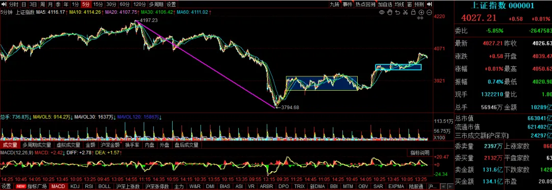 今日沪深两市成交2.42万亿,成交量较上一交易日放量315亿。两市实际上涨1702家,实际下跌3387家,实际涨停57家,实际跌停8家。主流资金今日净卖出766.51亿元,下图是今日资金进攻的板块路径此前表现最为强势的创业板指在早盘突破2021年高点后,进一步向上逼近3600点整数关,刷新10年多新高后,受到算力硬件、新能源等方向权重大票集中兑现压制,随后震荡回落跌超1%。虽然今日下跌个股增至3500多家,但跌超7%个股仍仅有30多家,整体调整力度较为克制。此前已经连续提及,作为近期最强的创业板指和中证1000指数,其日线KDJ已经连续运行于超卖区并呈现高位钝化,在连续跳空向上展开加速后,今日冲高回落展开补缺也在情理之中。因此当前创业板指能否持续站稳5日均线上方仍是短线强势延续的必要条件。上证日线走势结构:日线目前是震荡上行,今天是一个高位的整理,量能也没缩,这个位置依然是一笔的延续,只是这个结构容易形成顶分。上证5分钟走势结构:今天实际上是冲高之后,形成了一个1分钟回落。目前回落没有和前面中枢的高点进行接触,还是属于三买的状态。实际上还在重心上抬,后面还是要看能否打出高点。打完高点之后,如果两个上涨段发生背驰,那就可能在这个地方做第二个中枢,然后再看有没有离开,目前走势看还要慢慢走几天。关注核心支撑位4000点不破上升结构就没有破坏。