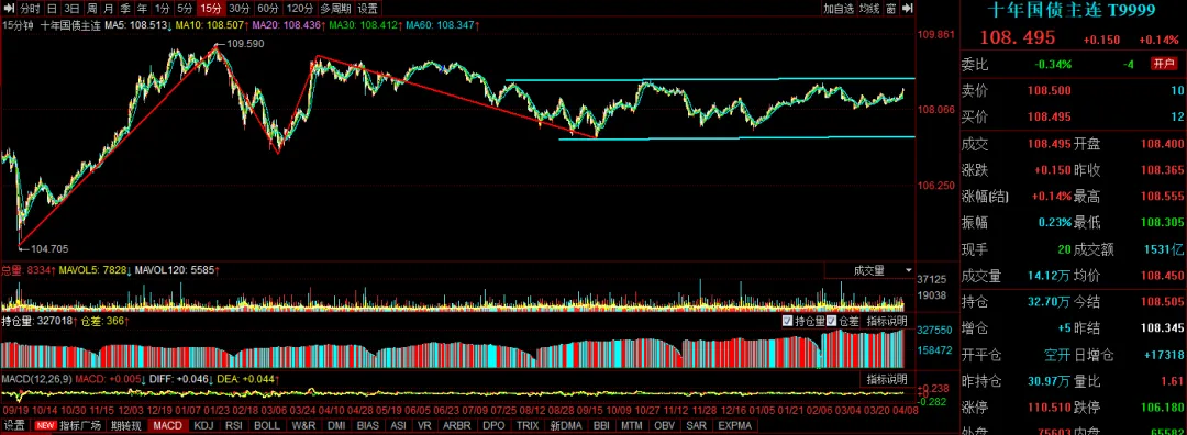 上图是十年期国债期货的15分钟K线走势图,目前15分钟是下跌一笔。1分钟上涨笔,目前股债的策略应该是债横盘,股票市场趋势向上。