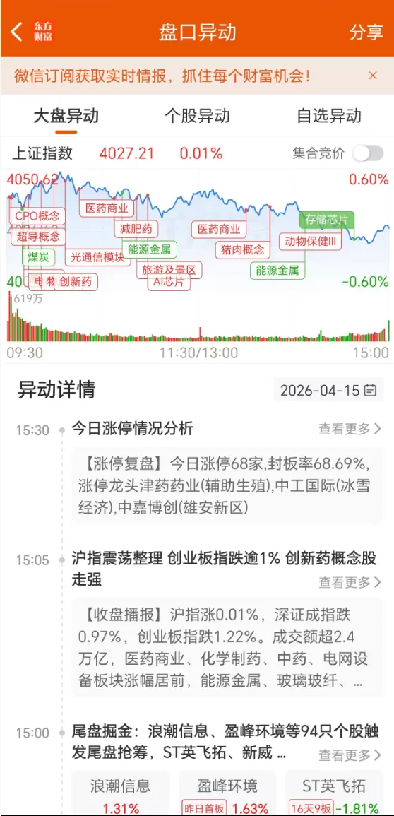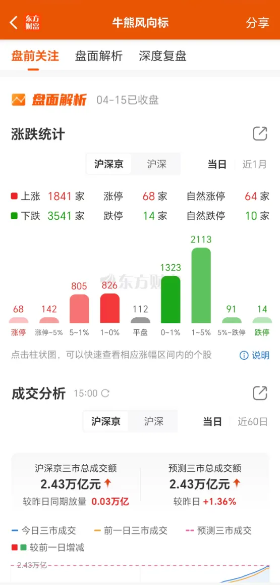 今日两市个股涨跌比为:1:1.92,涨停68家,跌停14家。板块异动上:14个板块异动活跃,4个板块异动走弱。热点板块减少,个股赚钱效应不佳。