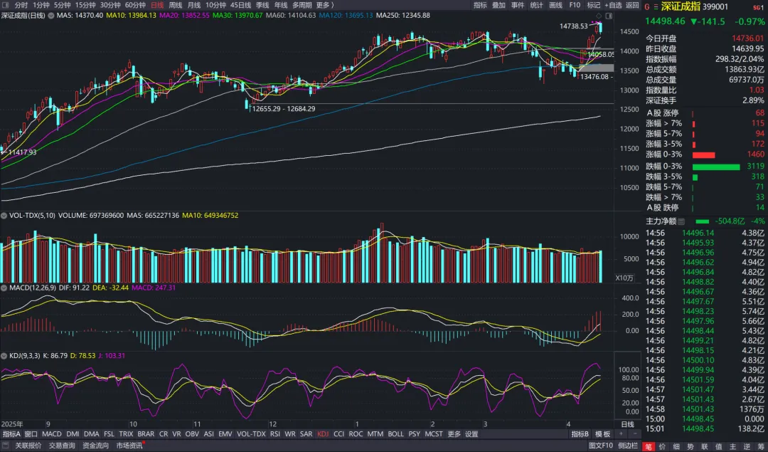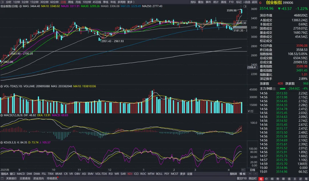今日深证成指和创业板指盘中再度创出牛市反弹新高,但随后均跳水回落。虽然因为特朗普表示“战争已经结束”的说法有所高开,但A股还是开启自己的节奏,主力抛压资金大幅增加,整体量能小幅放大,场外增量资金还是比较少。在量能不足情况下深成指和创业板指创出新高已经较为难得,但是距离前期的3万亿以上的成交还是大大不足,所以市场在高开资金抛压后选择了调整。