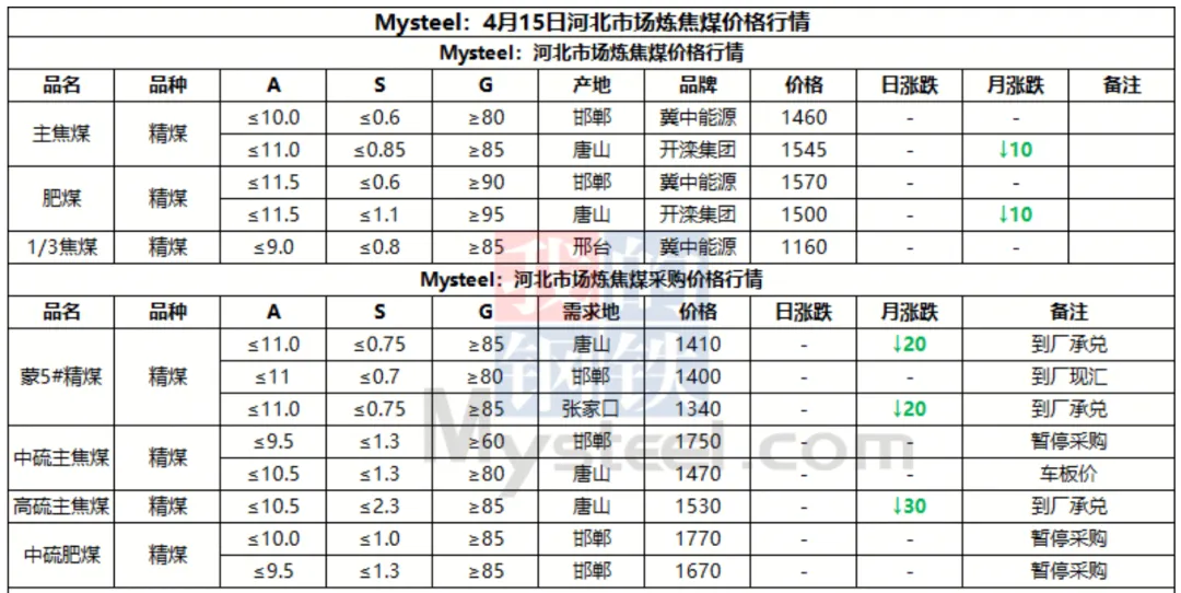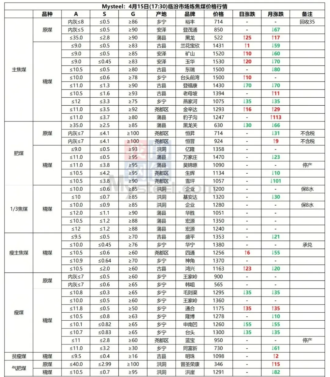 15日临汾市场炼焦煤价格震荡运行。区域内多数煤矿维持正常生产,焦煤供应量相对稳定;洗煤厂及贸易商出货情况一般,多数煤种价格未有明显改观,目前尧都区高硫强肥煤持稳执行1360元/吨;需求方面,上周铁水日均产量恢复至 239.38万吨,下游有一定的刚需支撑,但同时终端钢材去库情况及利润方面目前仍旧一般,故后续仍需关注下游企业利润边际及库存走势等的改善情况。综合来看,预计短期内临汾市场炼焦煤价格将震荡运行。