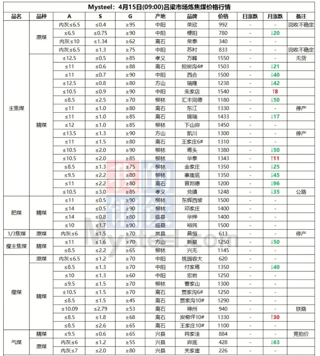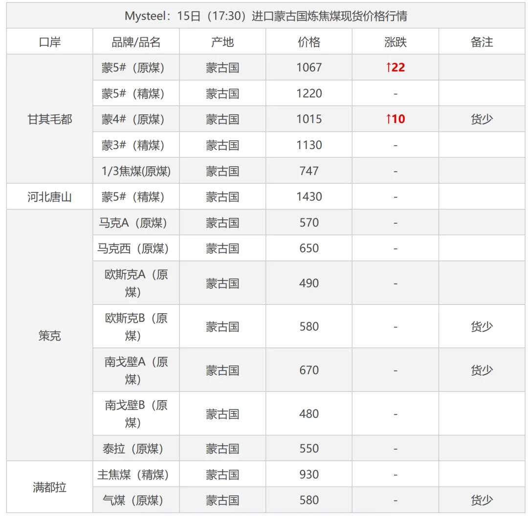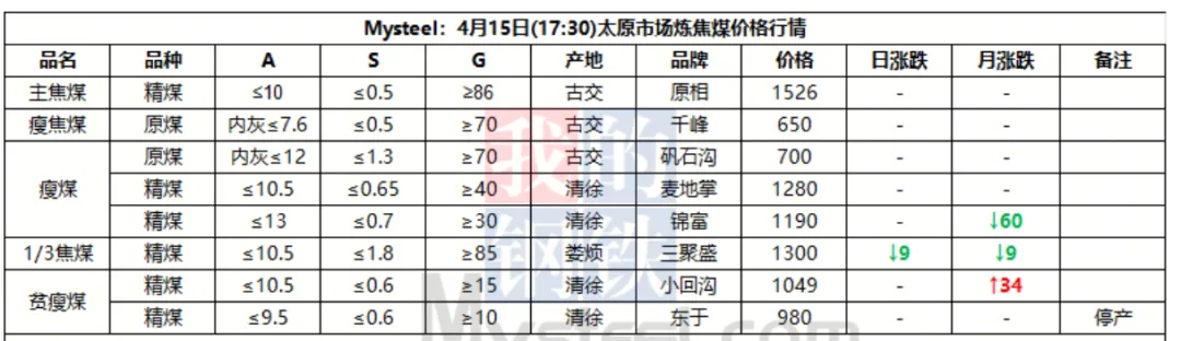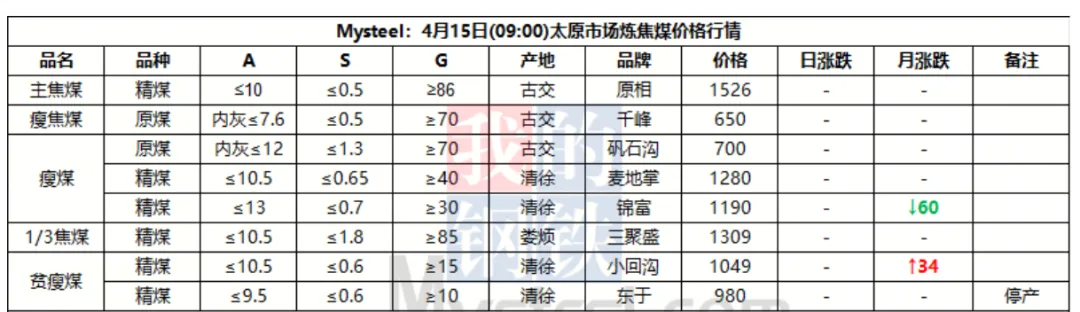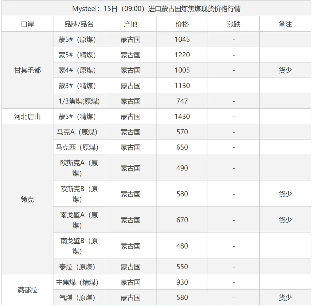 15日太原市场炼焦煤价格暂稳。本周炼焦煤市场行情震荡,成交环比有所好转,部分煤矿价格上涨20-40元/吨。近期部分区域煤矿因事故停产,但所属集团及区域内其他煤矿未有明显影响,产地煤矿产量并未明显下滑。随着铁水产量回升,焦煤需求进一步改善,炼焦煤整体库存并未明显累积,市场基本面矛盾不大,短期煤价将以窄幅震荡为主。