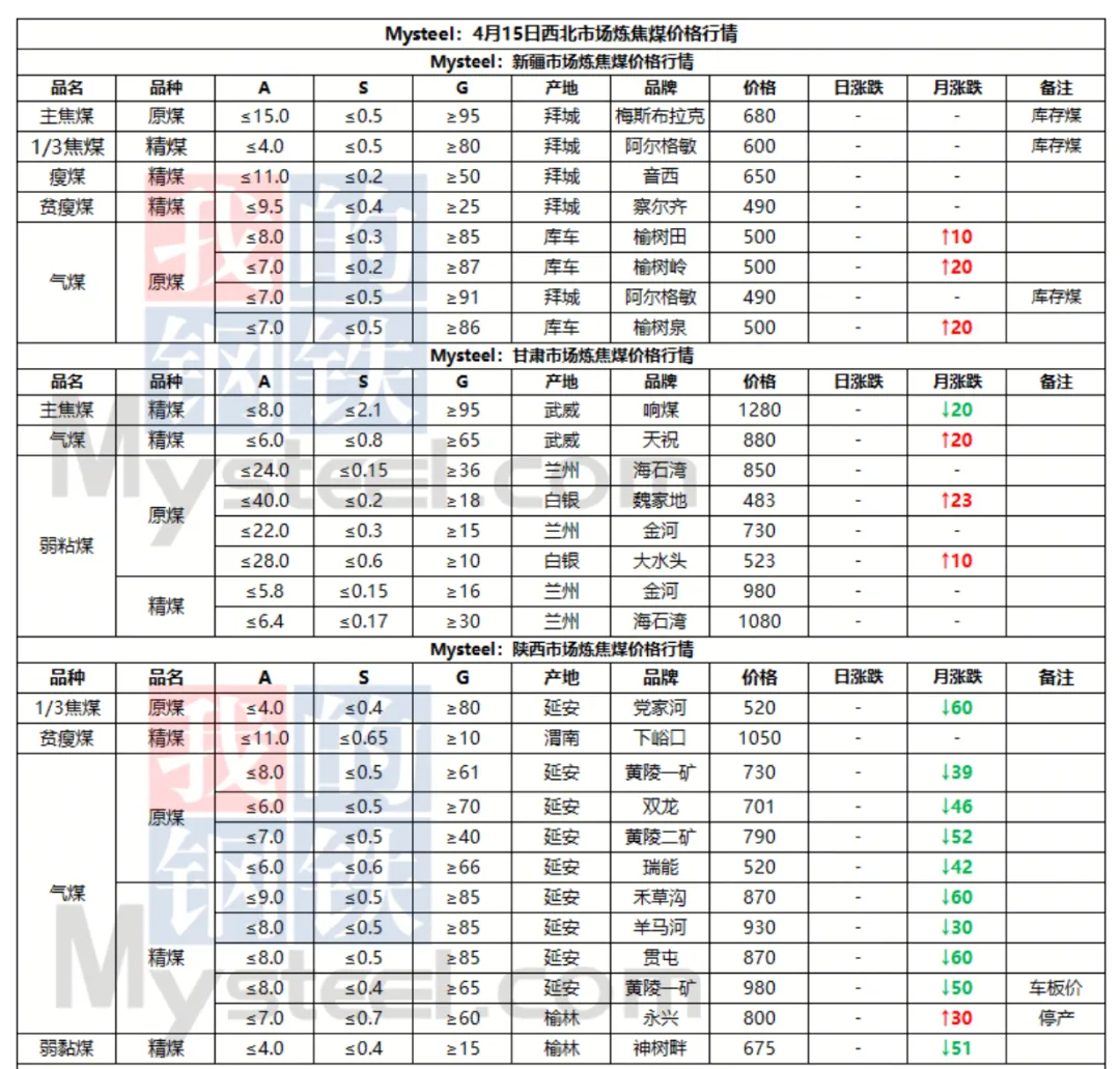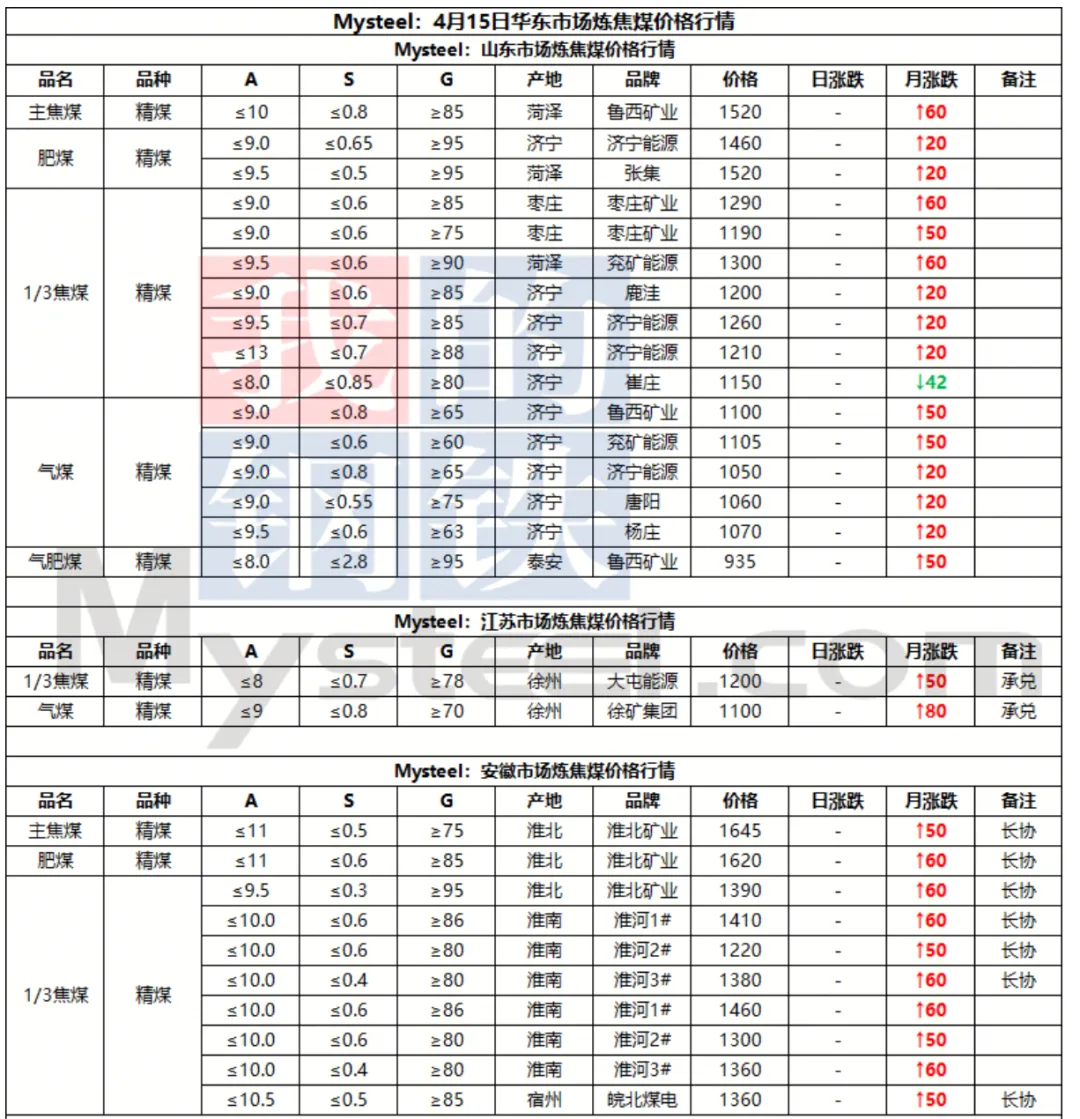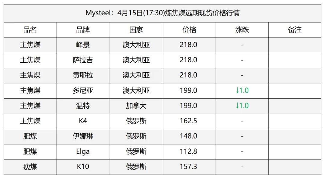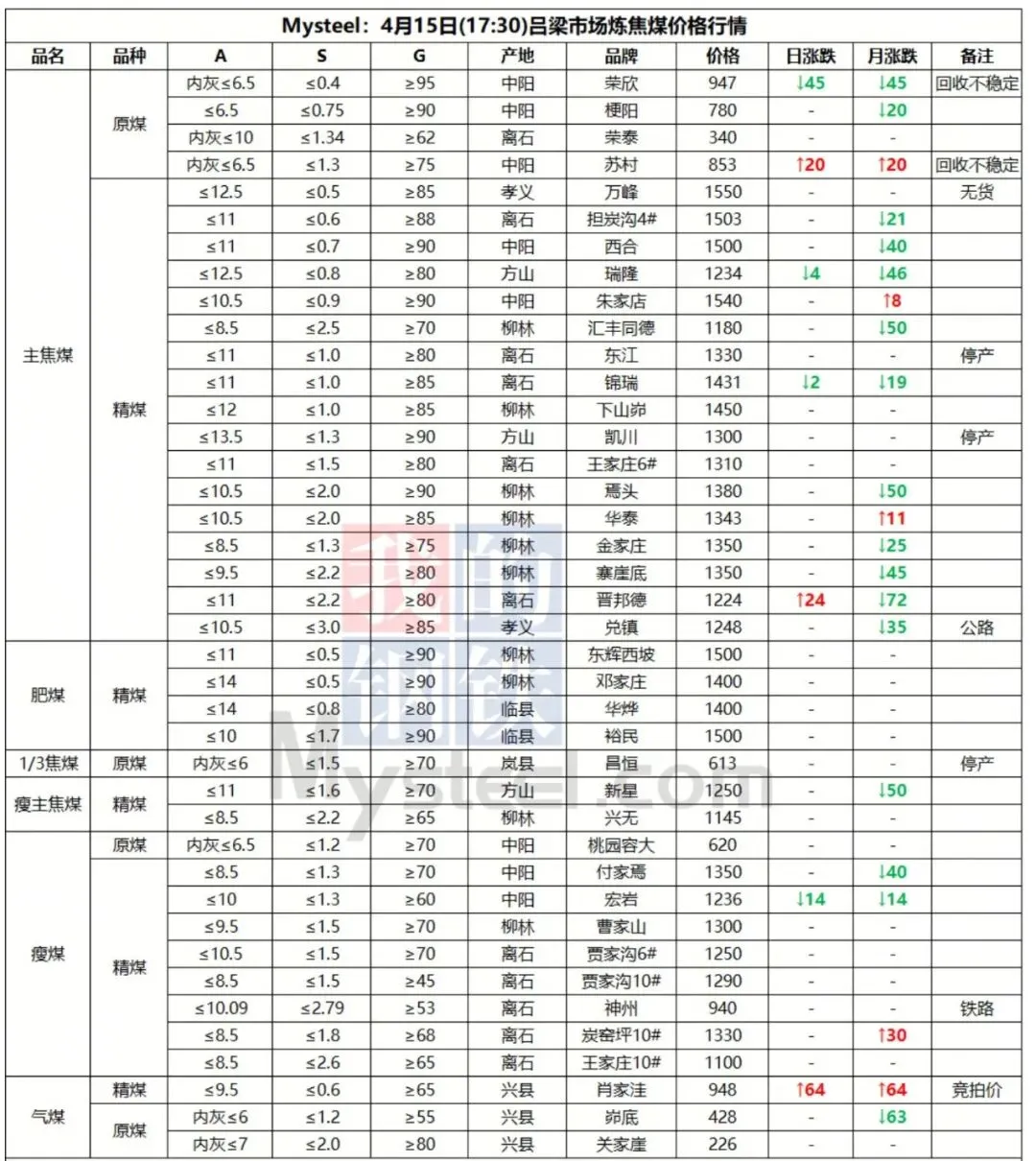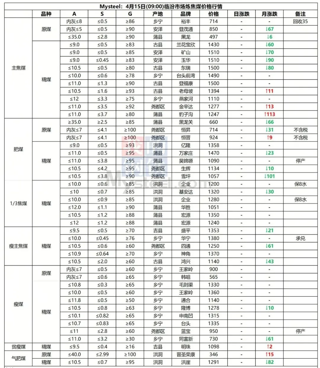 15日太原市场炼焦煤价格暂稳。本周炼焦煤市场行情震荡,成交环比有所好转,部分煤矿价格上涨20-40元/吨。近期部分区域煤矿因事故停产,但所属集团及区域内其他煤矿未有明显影响,产地煤矿产量并未明显下滑。随着铁水产量回升,焦煤需求进一步改善,炼焦煤整体库存并未明显累积,市场基本面矛盾不大,短期煤价将以窄幅震荡为主。