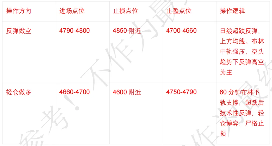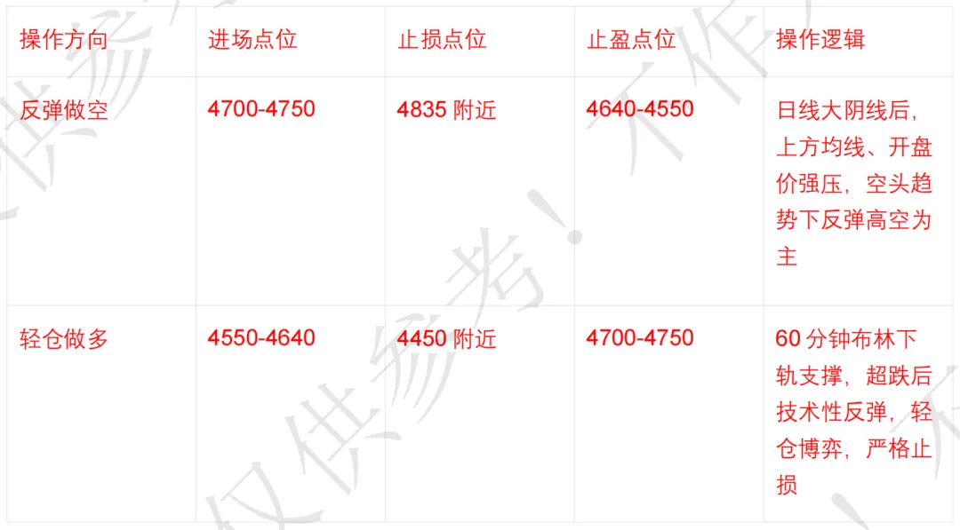 • 关键价位:支撑位 4700、4600;压力位 4750、4800、4850。