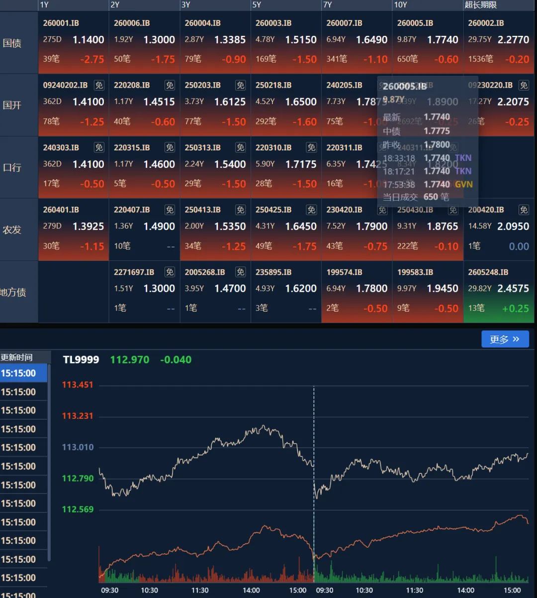 今天债券情绪继续延续偏暖态势,早盘债市情绪总体平稳,10Y国债利率(260005)微幅高开在1.783%后震荡。上午股市小幅收涨0.37%,10Y国债利率在1.78%附近震荡。今日国债继续分化,超短端及中短端期限表现较好,而长端及以上期限表现一般。全天来看,1-7Y下行0.95-2.75bp,10Y及以上下行0.3-0.5bp,其中5Y大幅下行1.75bp,1Y大幅下行2.75bp,下行最多。今日政金债整体表现与国债同步,收益率整体普遍下行0.25-1.5bp