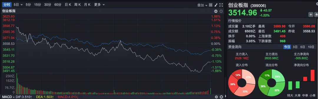 今天的行情上演了一出什么叫做开局好戏,结局烂尾的走势。最终高开低走,沪指尾盘权重拉升护盘勉强翻红,而创业板十年新高之后上演跳水场面,最终收跌1%+。