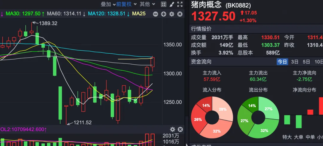 猪肉,昨天还在聊。今天果然延续走强,随着本周前三天的表现,越来越多人在谈猪肉的历史大底部机会了,今天生猪期货也大涨,期货+A股联动,你会怎么选择呢,昨天咱们聊到的,这里是喜欢做中长线低位超跌方向的朋友配置的好机会,不想每天做短线折腾的朋友,还真的可以考虑。