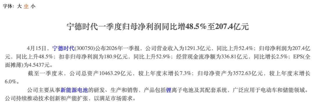 晚上宁王发布了一季报的业绩,太抢眼了,一个季度又赚了200个亿,难怪今天一度也是又新高的,明天看看股价怎么反馈,就大概知道锂电和储能这块的个股会怎么走了。