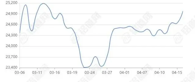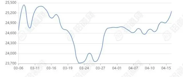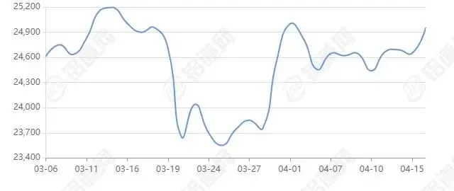 2026年04月16日上海期货行情价24950涨跌+110,最低24805,最高25375,前三日均价24668,前五日均价24618。