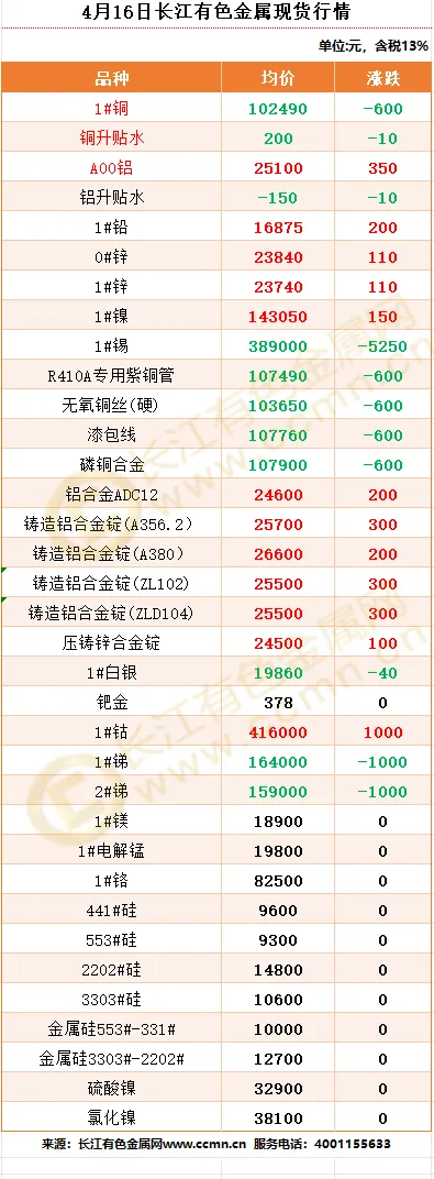 >4月16日长江有色金属现货行情