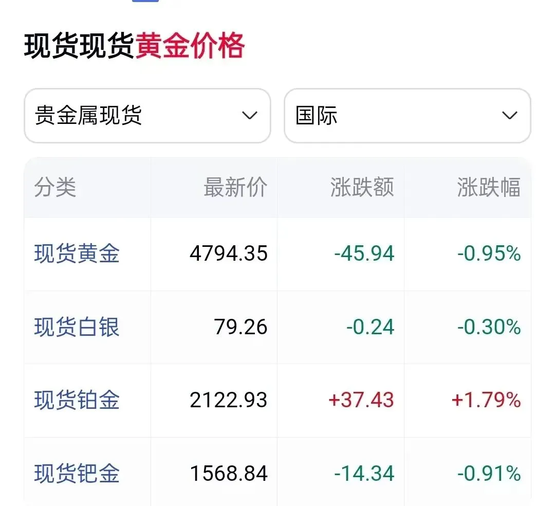 国际现货黄金报4794.35,下跌45.94,跌幅0.95%;现货白银79.26,跌幅0.30%;现货铂金2122.93,上涨37.43,涨幅1.79%;现货钯金1568.84,跌幅0.91%。此次金价回调多为短期获利了结,避险逻辑依旧有效。