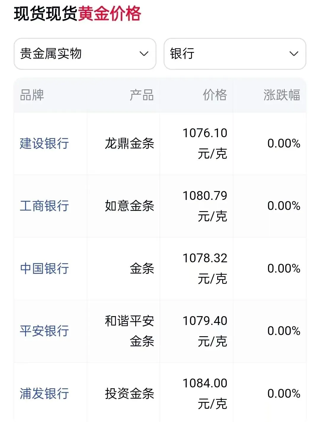 银行金条报价平稳:建行1076.10元/克、中行1078.32元/克、平安银行1079.40元/克、工行1080.79元/克、浦发银行1084.00元/克,溢价较低适合投资。