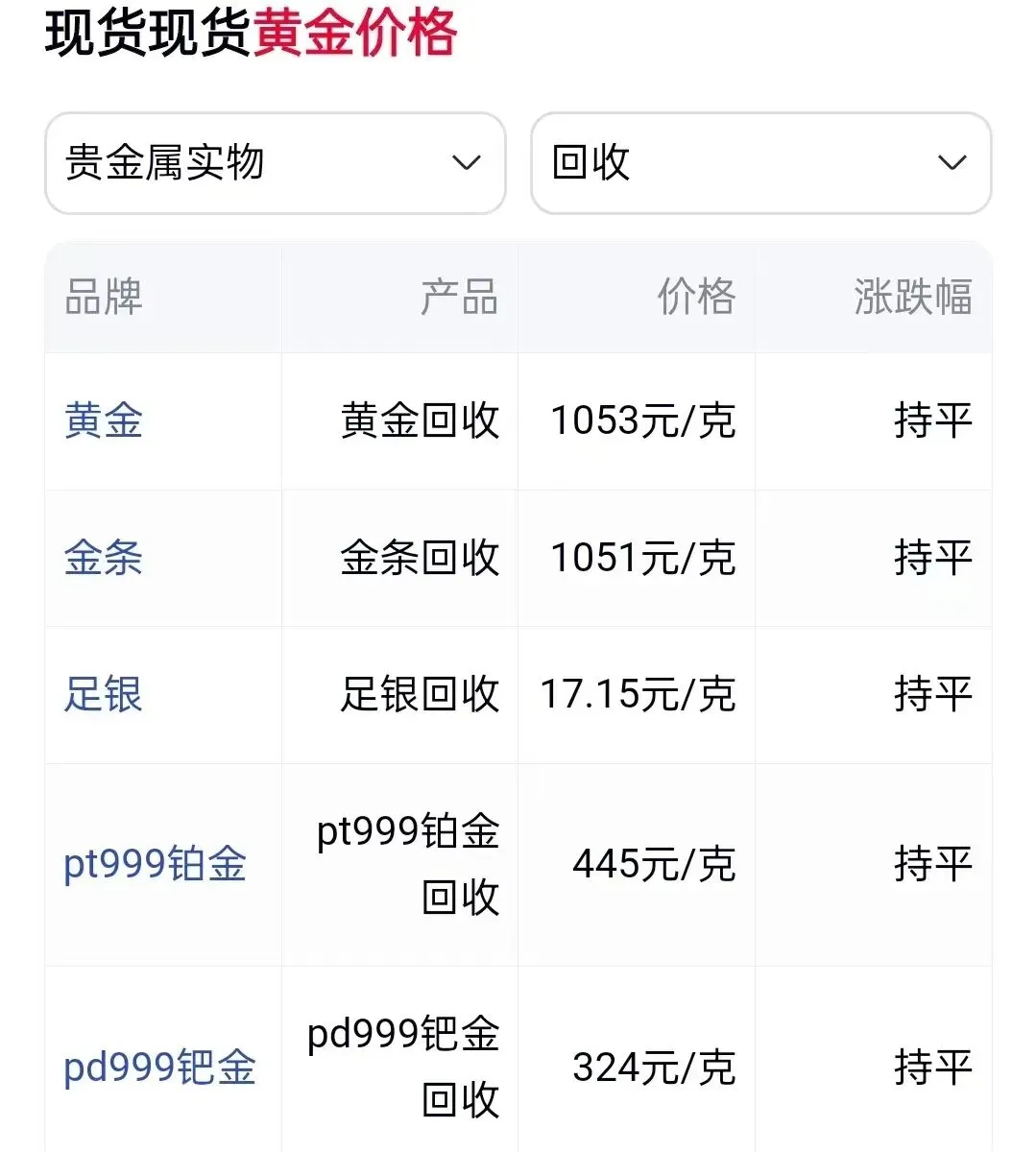 回收价格稳定:黄金回收1053元/克,金条回收1051元/克,足银17.15元/克,铂金445元/克,钯金324元/克,首饰回收不计品牌溢价,仅看纯度克重。