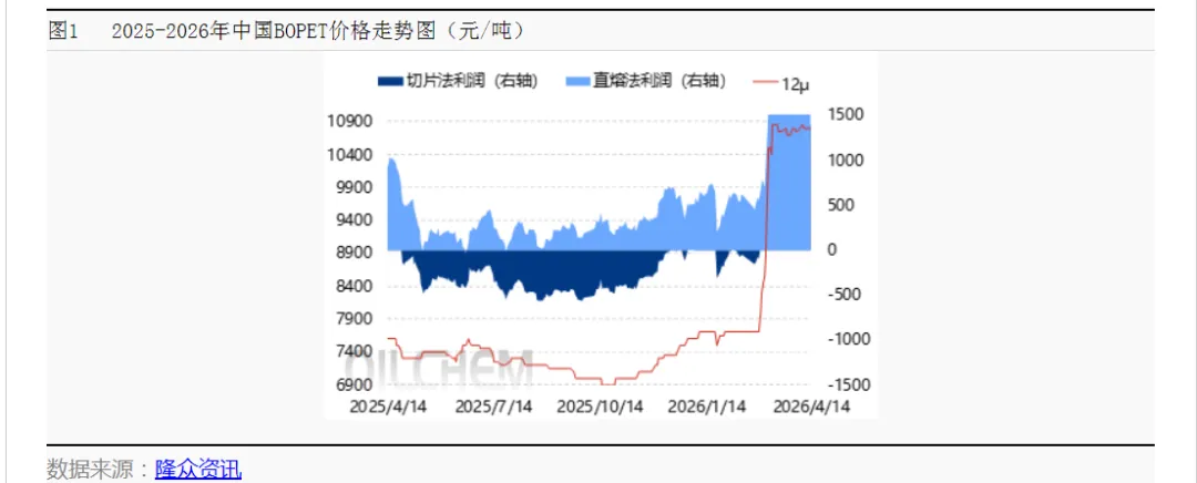 导语:开年以来,受中东地缘冲突激化及上游原料成本大幅攀升影响,BOPET市场价格出现超预期上涨。进入四月份,随着传统淡季压力逐步显现,加之地区局势存降温预期,BOPET市场上行动能已明显受限。 自2月底以来,美伊对峙升级引发的霍尔木兹海峡通行风险持续发酵,地缘溢价驱动原油强势攀升。成本端剧烈波动下,BOPET膜价受强支撑一度触及10850元/吨阶段高点。随后市场进入高位博弈,地缘消息反复令油价涨势收敛,而下游印刷及复合包装企业对高价抵触明显,新单跟进乏力。多空交织下,BOPET涨势虽收窄,但原料底部支撑坚实,回调空间受限。当前市场呈现成本托举与需求压制的双重格局,主流商谈重心持续在10750—10800元/吨窄幅区间内宽幅震荡运行。虽然成本端大幅反弹对BOPET形成有力支撑,价格随之被动推涨。但是下游需求跟进明显不足,加之原料端受地缘局势反复扰动,市场心态在追涨与观望之间谨慎心态不减。软包装领域传统的“金三银四”旺季在今年明显跟进有限,市场活跃度远不及往年同期。订单结构正加速向“散、小、短”演变。不仅订单数量有限,交付周期也被大幅压缩。夏季品类所需的轻量化包装虽偶有零星补单,但多为追补库存的应急行为,根本无法汇聚成规模性的批量支撑。与此同时,食品、日化等快消品领域的包装需求同样疲软,下游企业下单极为克制,长期、稳定的大单踪迹难觅,市场缺乏核心订单的托底效应。